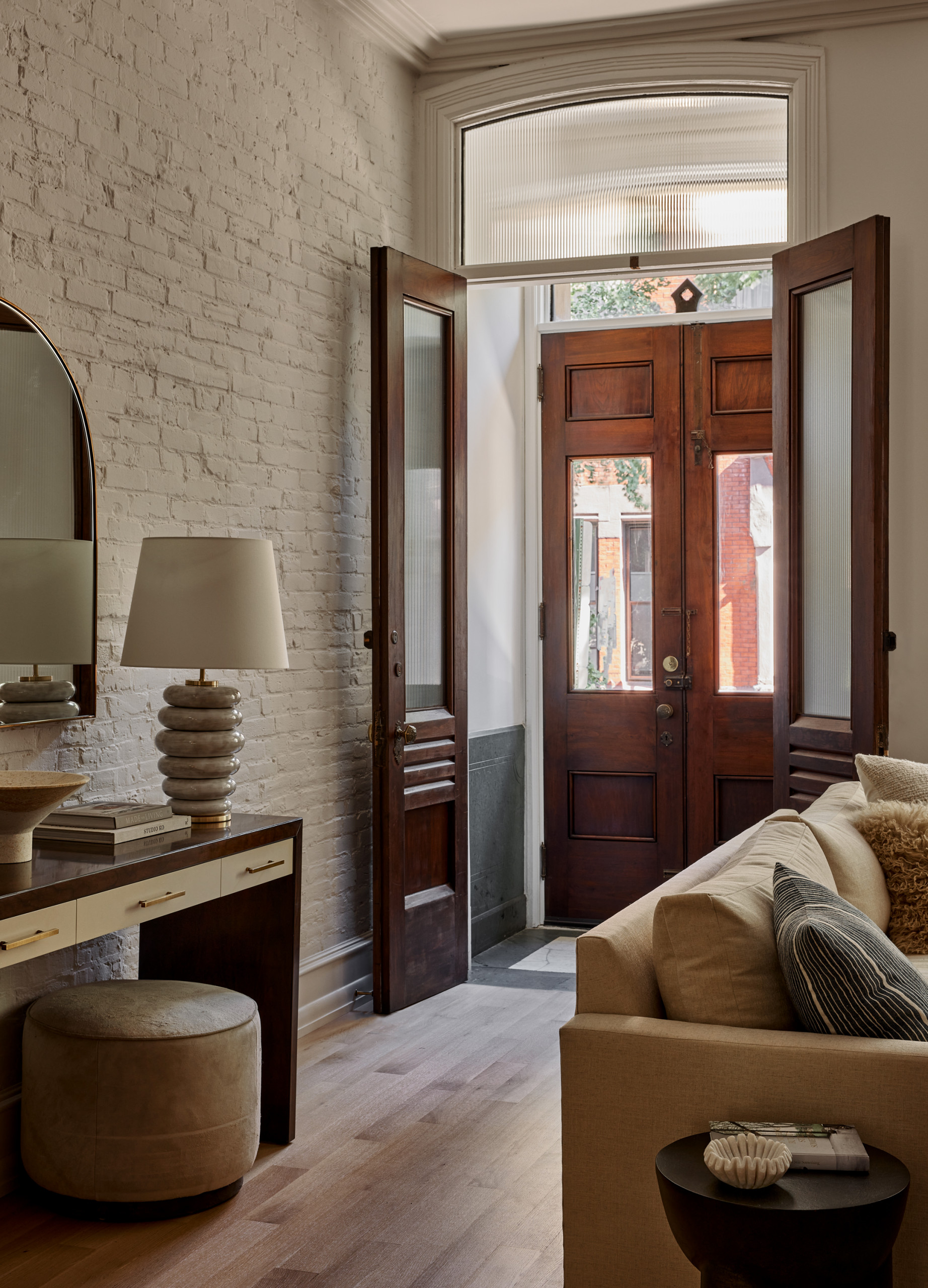 Many entryways open into a narrow hallway or tight vestibule. If this is the case with yours, consider a console table, a bench and small stools that can be tucked away — they can be game-changing.