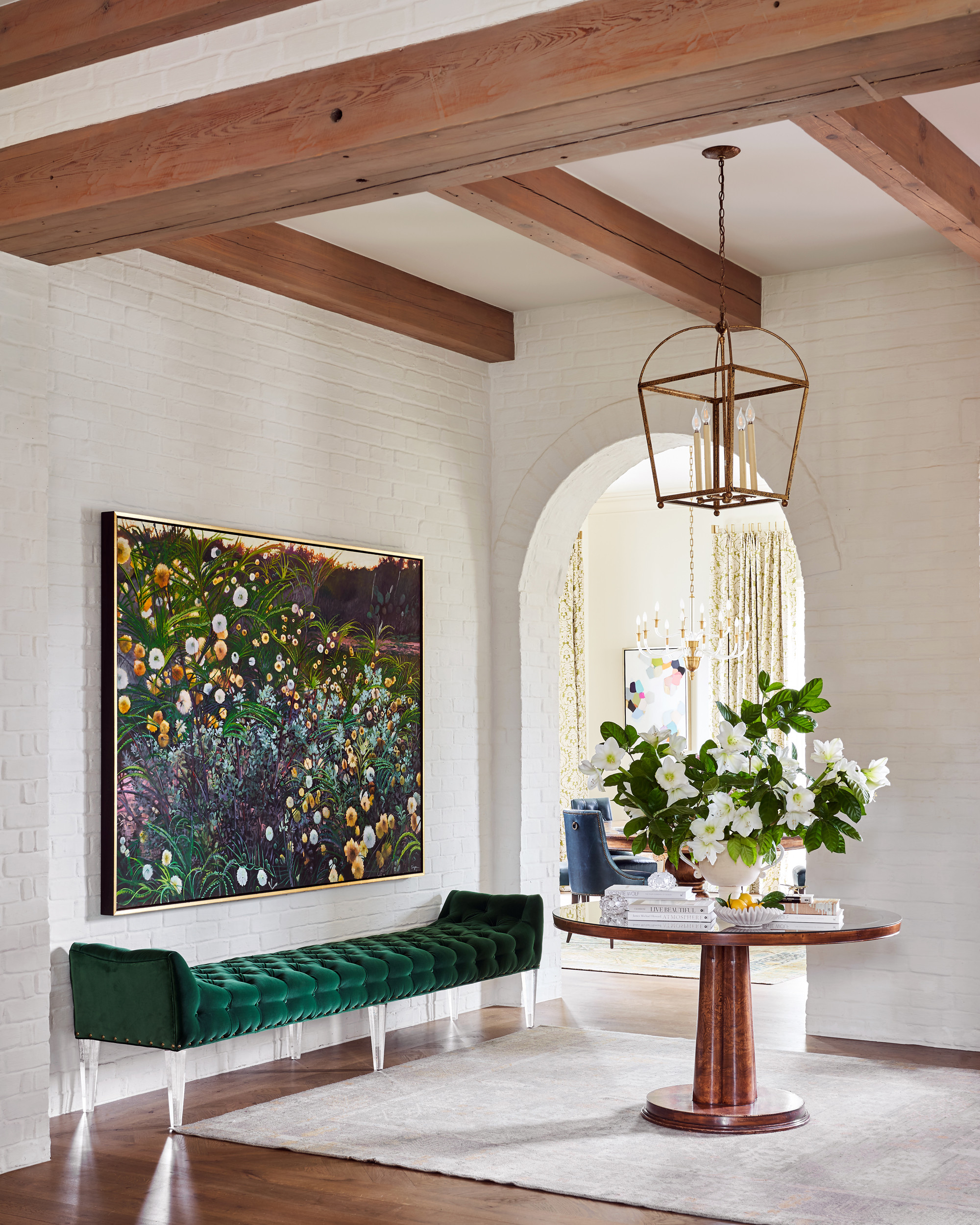 If you’ve got a more open and spacious entry, consider pressing a long, narrow, backless bench against the wall to add seating and style. A round table with art books, accessories and a vase with fresh flowers beneath a large light fixture makes a timeless design statement.
