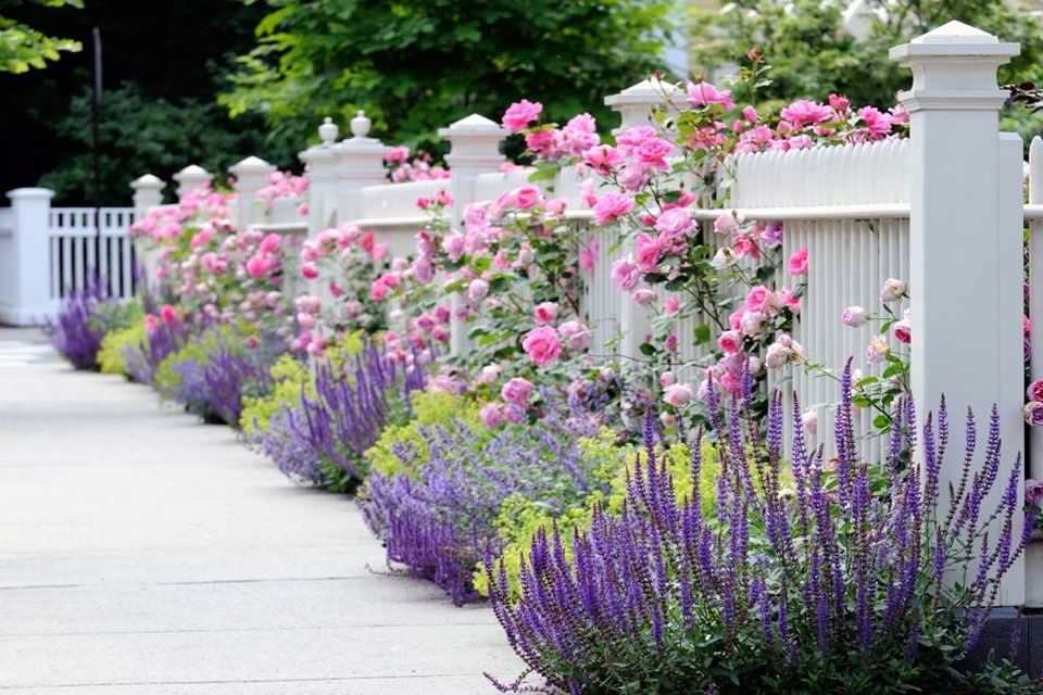 - All the plants are lower than the height of the split-rail fence; allowing the fence to be glimpsed down the entire sidewalk gives the illusion of one continuous border.