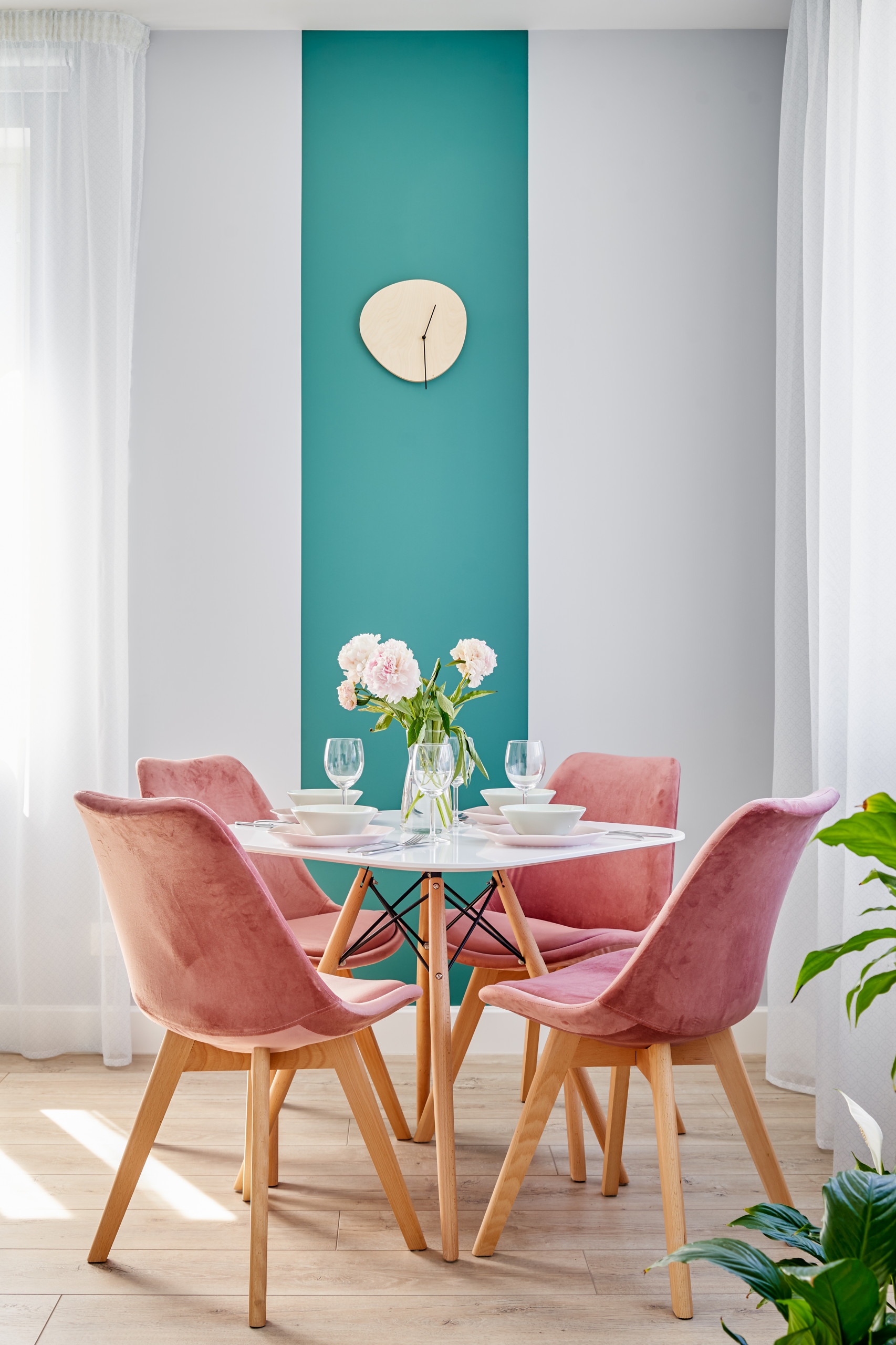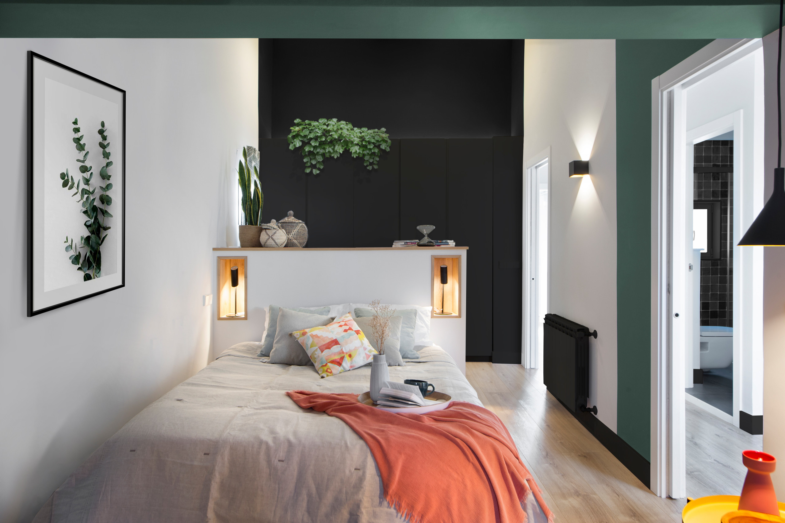 Of course you can also combine vertical and horizontal blocks of color. And if you color-block with two different vibrant hues, you will end up with a unique and lively focal point. There’s no need to add much more to the room to decorate it, which is great if your space is small or you prefer not having too much stuff around the house.