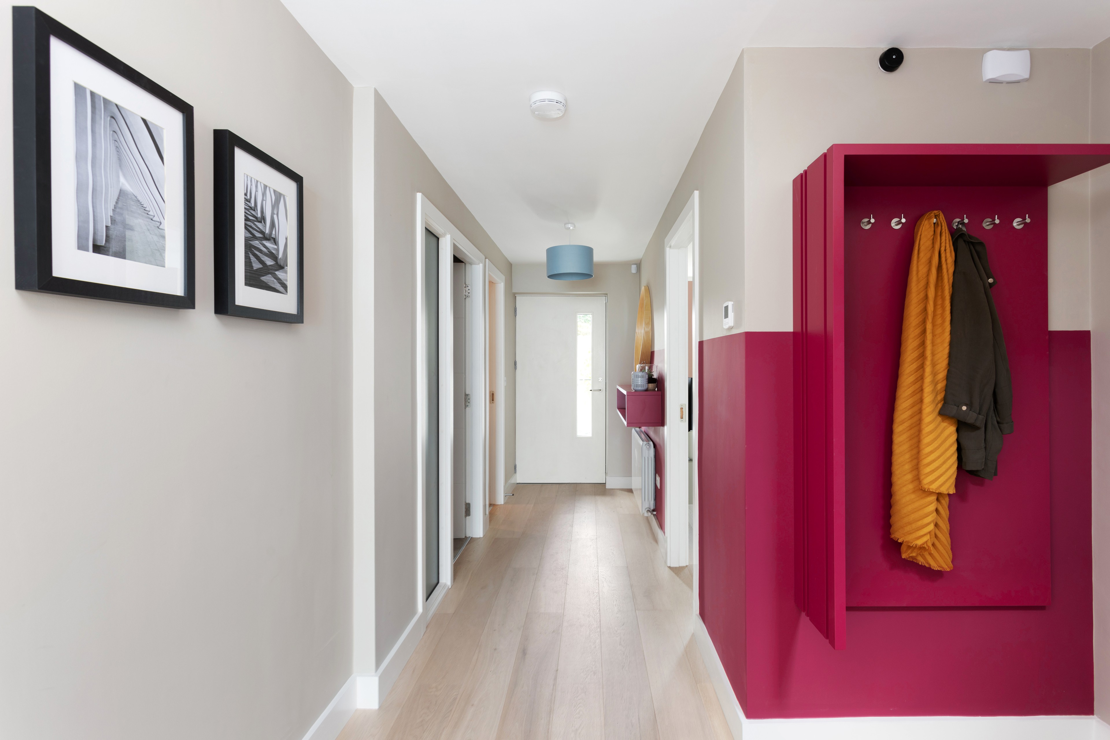 This small section of hallway has gotten the horizontal color-blocking treatment in a bold magenta. This is an excellent way to dress up an area of the home that is often overlooked. You can really go for any color you like here, especially if you keep the bulk of the colors light and neutral, as has been done in this example.