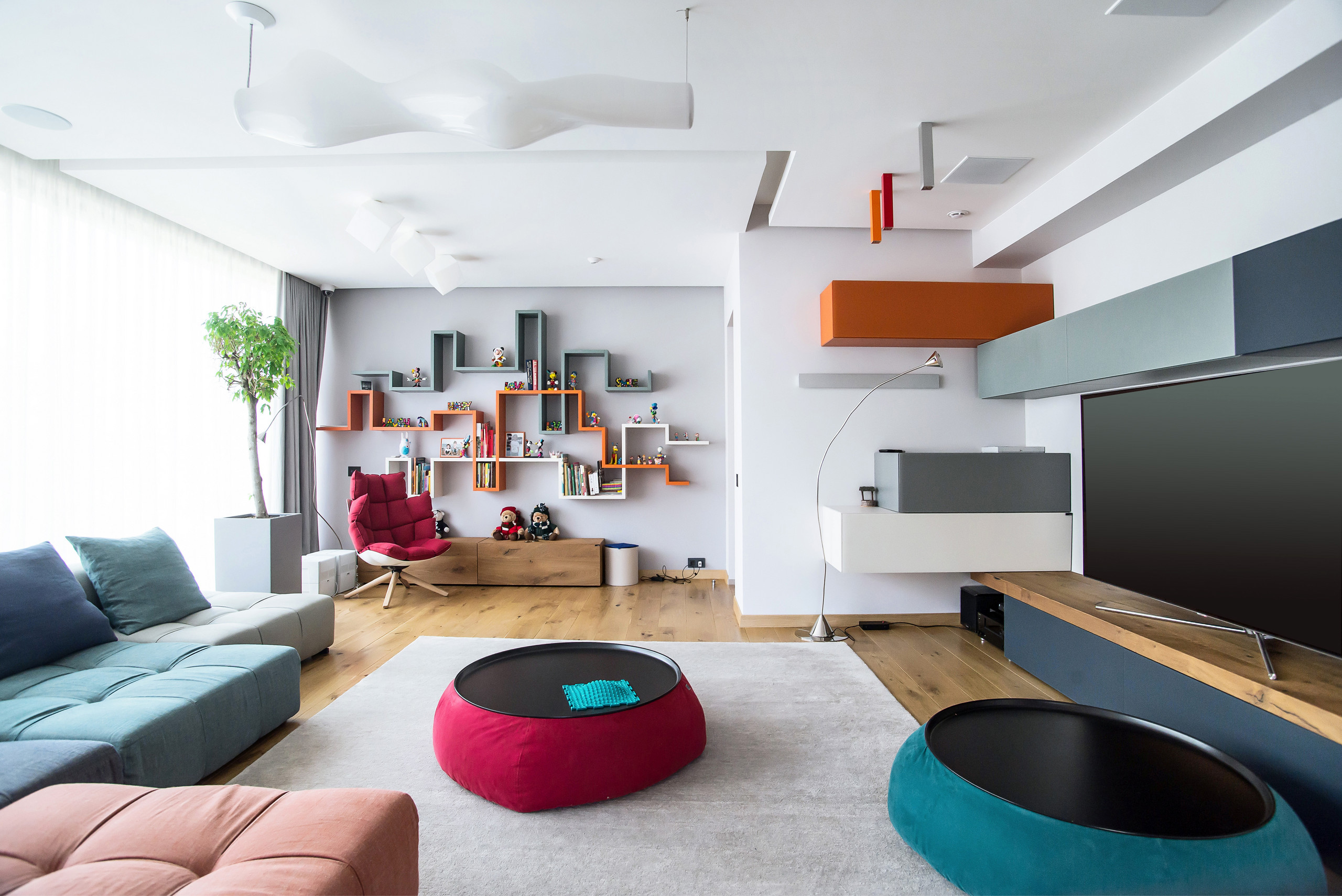 The blue cube is such a nice touch in this otherwise light and neutral room. I’m not sure what’s in there, but if I was in the space, I’d want to go check it out. It is the focal point due to the block of bold color it brings to the space.