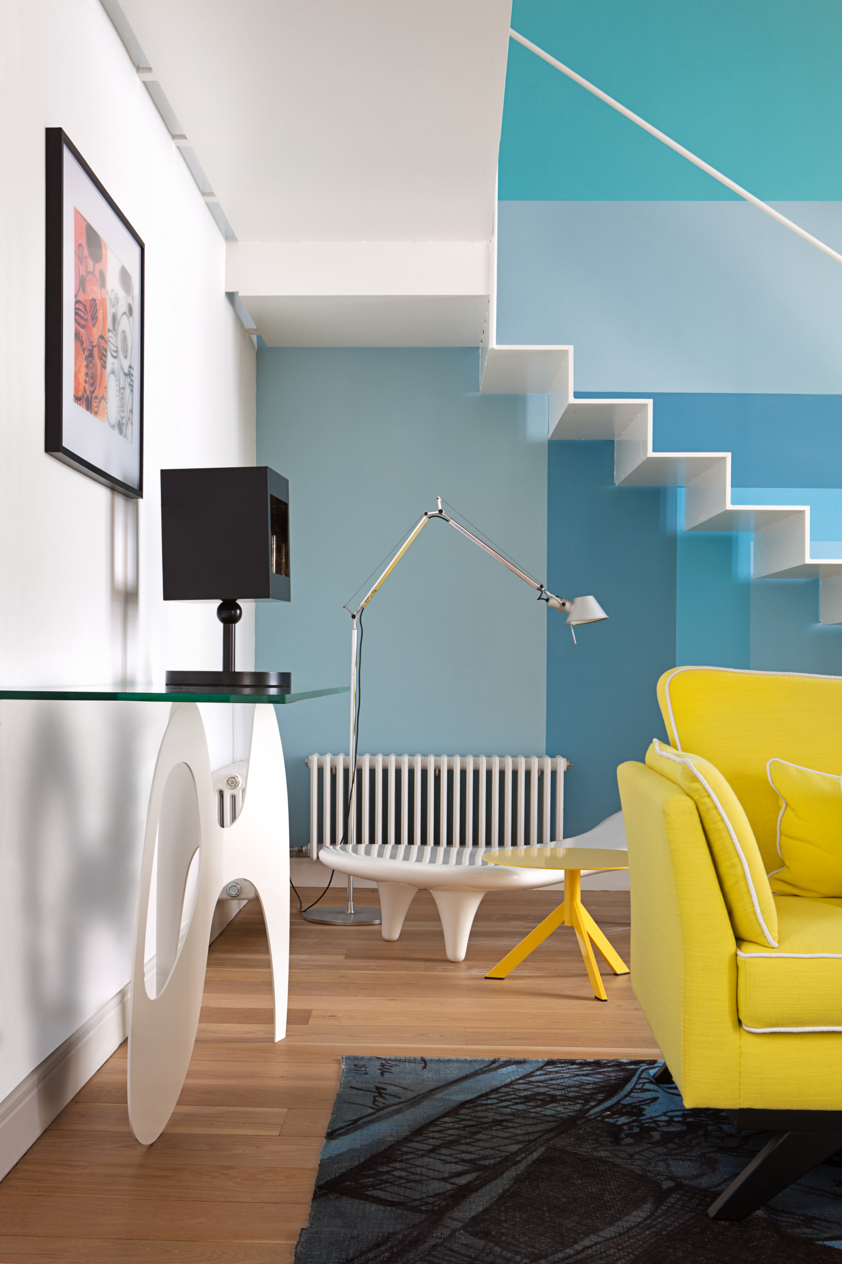 An entire room in a color such as bold yellow would be way too intense, but a more manageable block of it as an accent, surrounded by other blocks of softer and more neutral colors, looks fantastic.