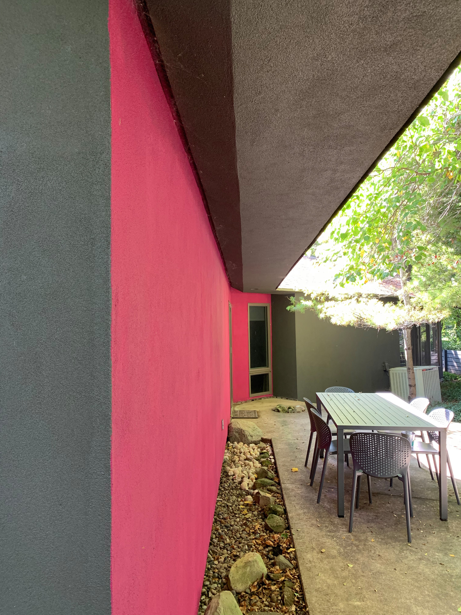 A block of shocking pink adds a dynamic boost to this home’s backyard patio. The homeowner wanted a punchy contrast to the dark warm gray siding color, and she got it.