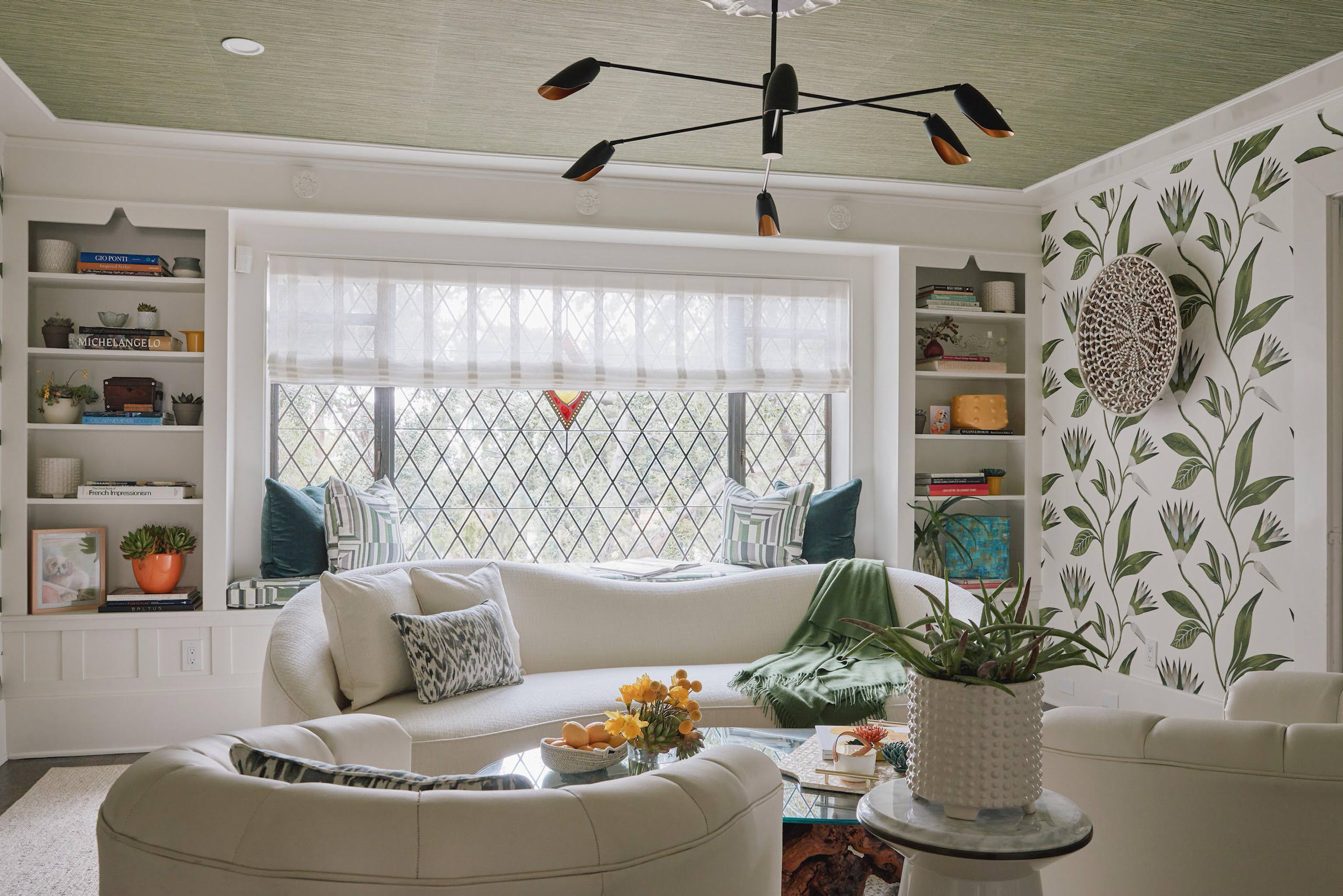 24. In this L.A. living room by Straus Design/Build, a light and airy botanical wallpaper supports other greenery found throughout the room. Meanwhile, a grasscloth paper on the ceiling adds texture and a sense of intimacy.