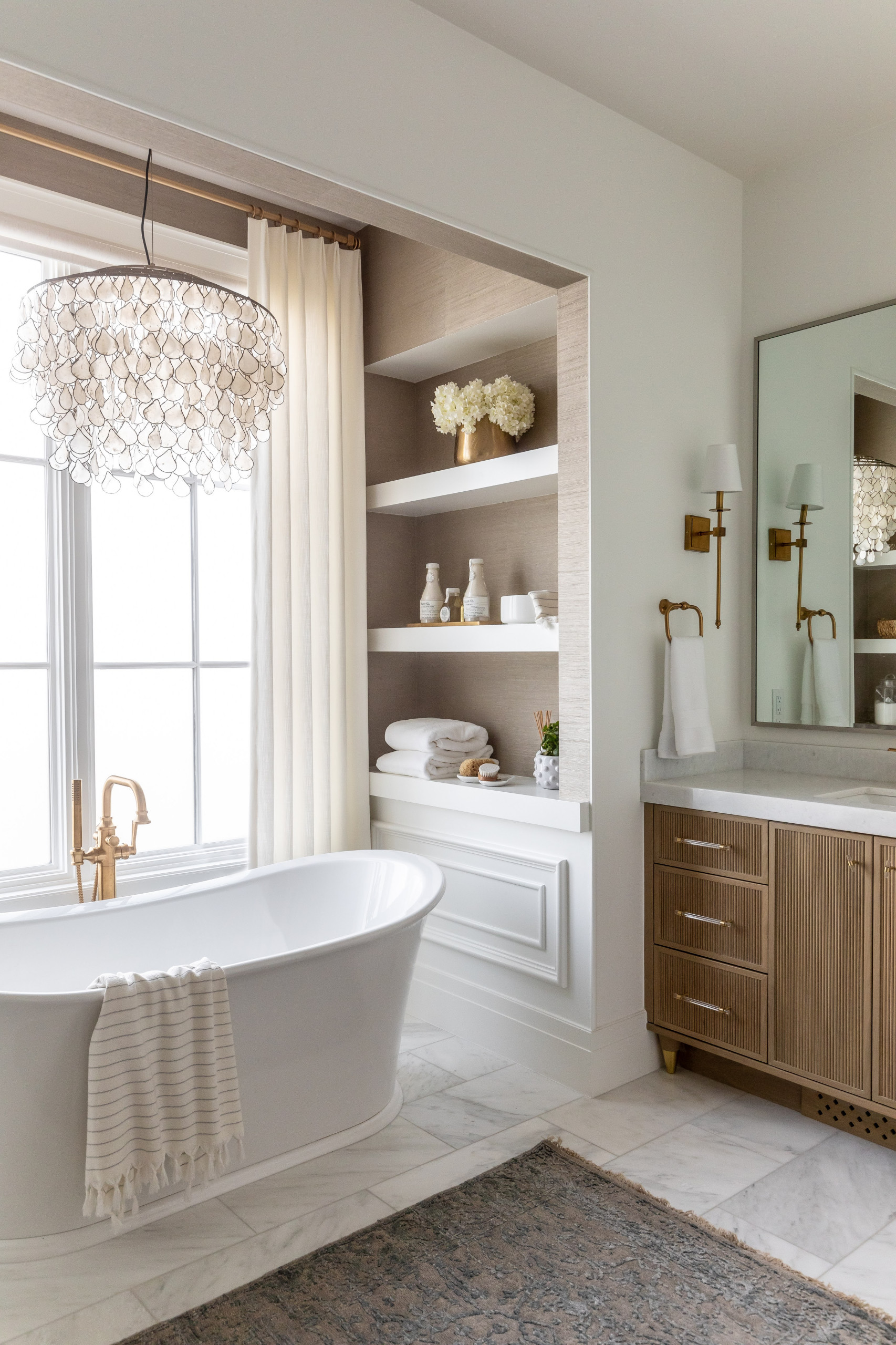 13. Here, a textured wallpaper adds nuance to a bathtub alcove in a Salt Lake City home by JCD Custom Home Design.