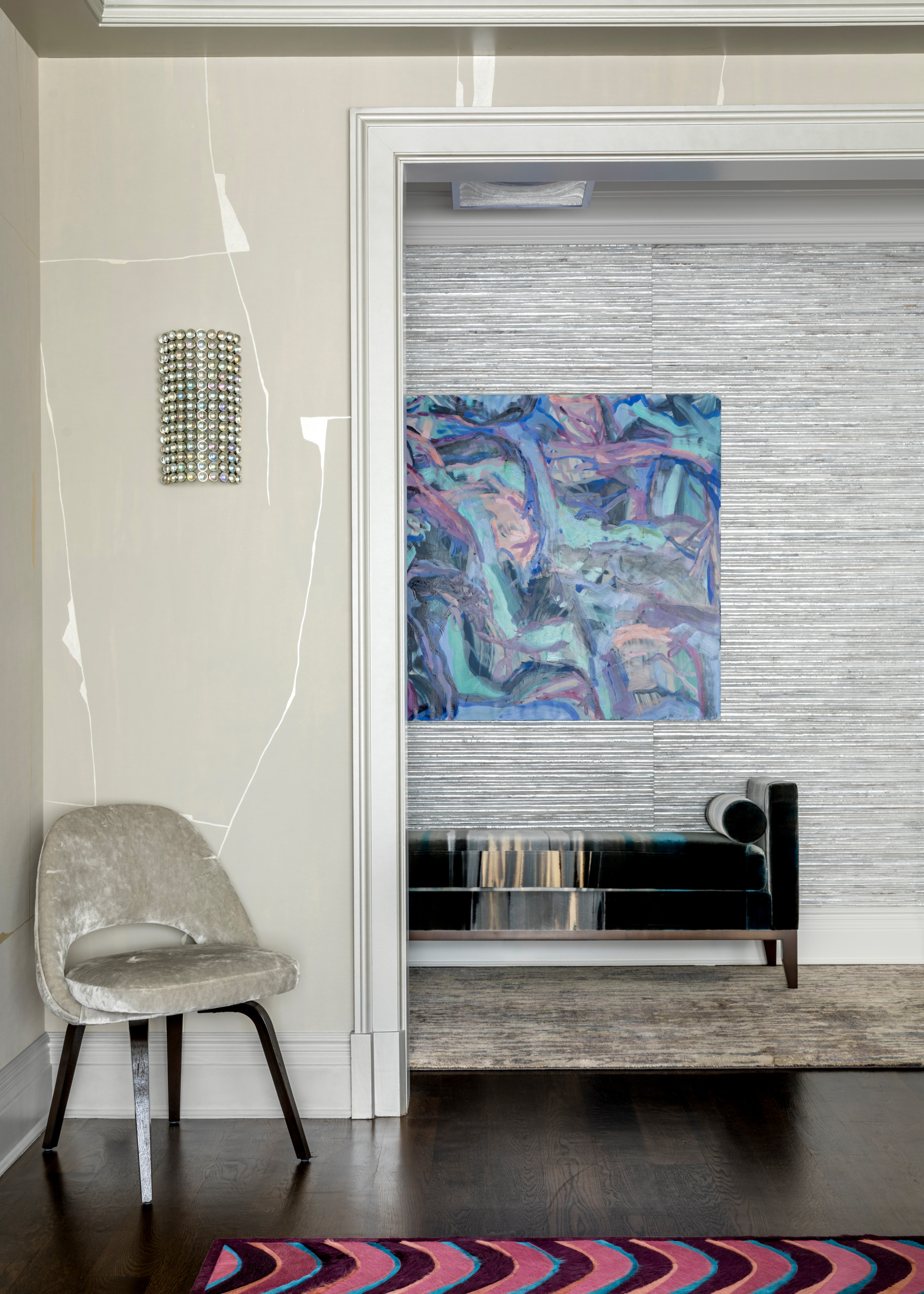 37. An abstract print runs floor to ceiling in this Toronto entry by Jodie Rosen Design, providing a spirited backdrop for a floating bench and open shelf unit.