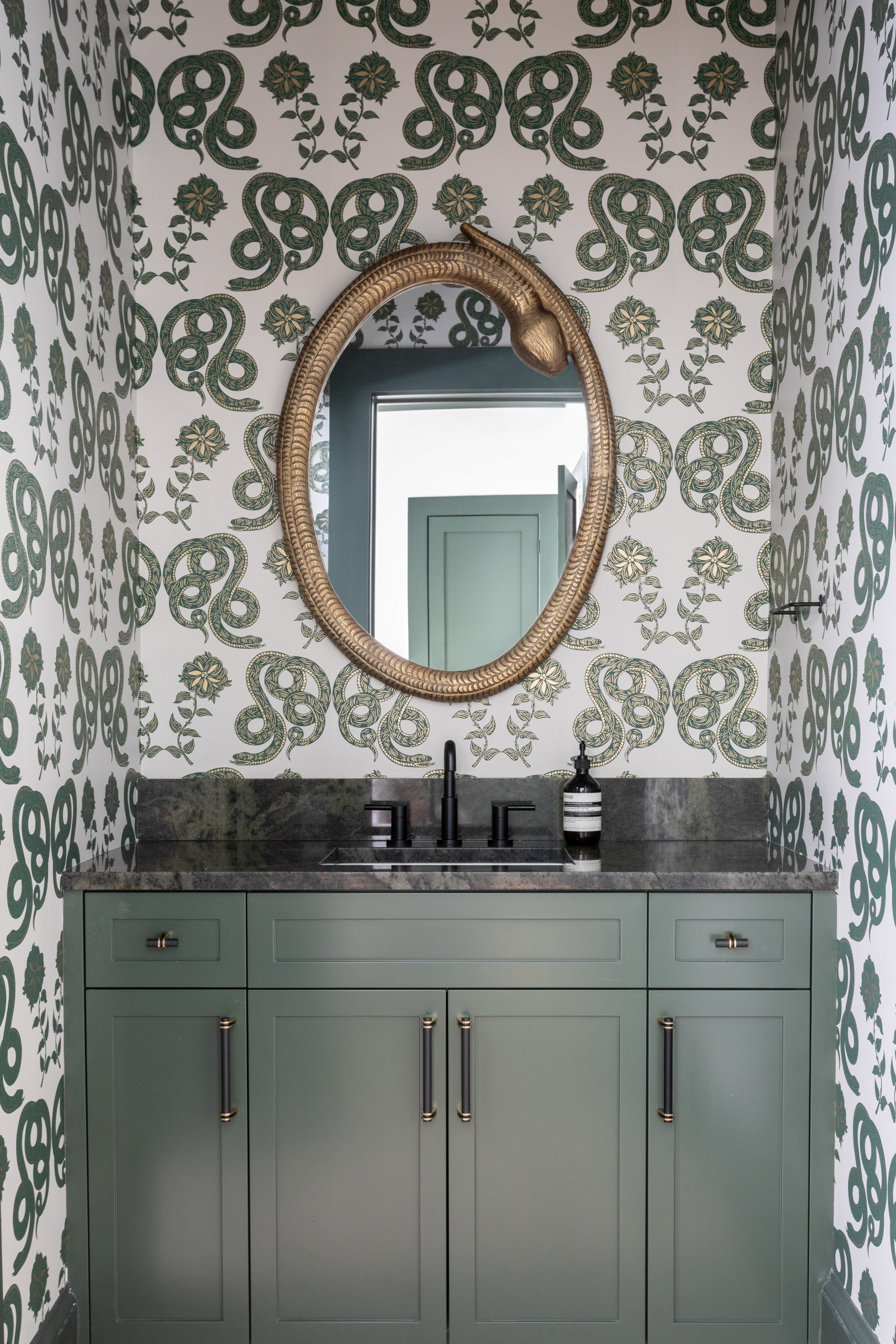 4. In this moody Atlanta-area powder room by Presmanes Interiors, an attractive wallpaper features curly juniper-colored snakes (Serpentine by Hygge & West).