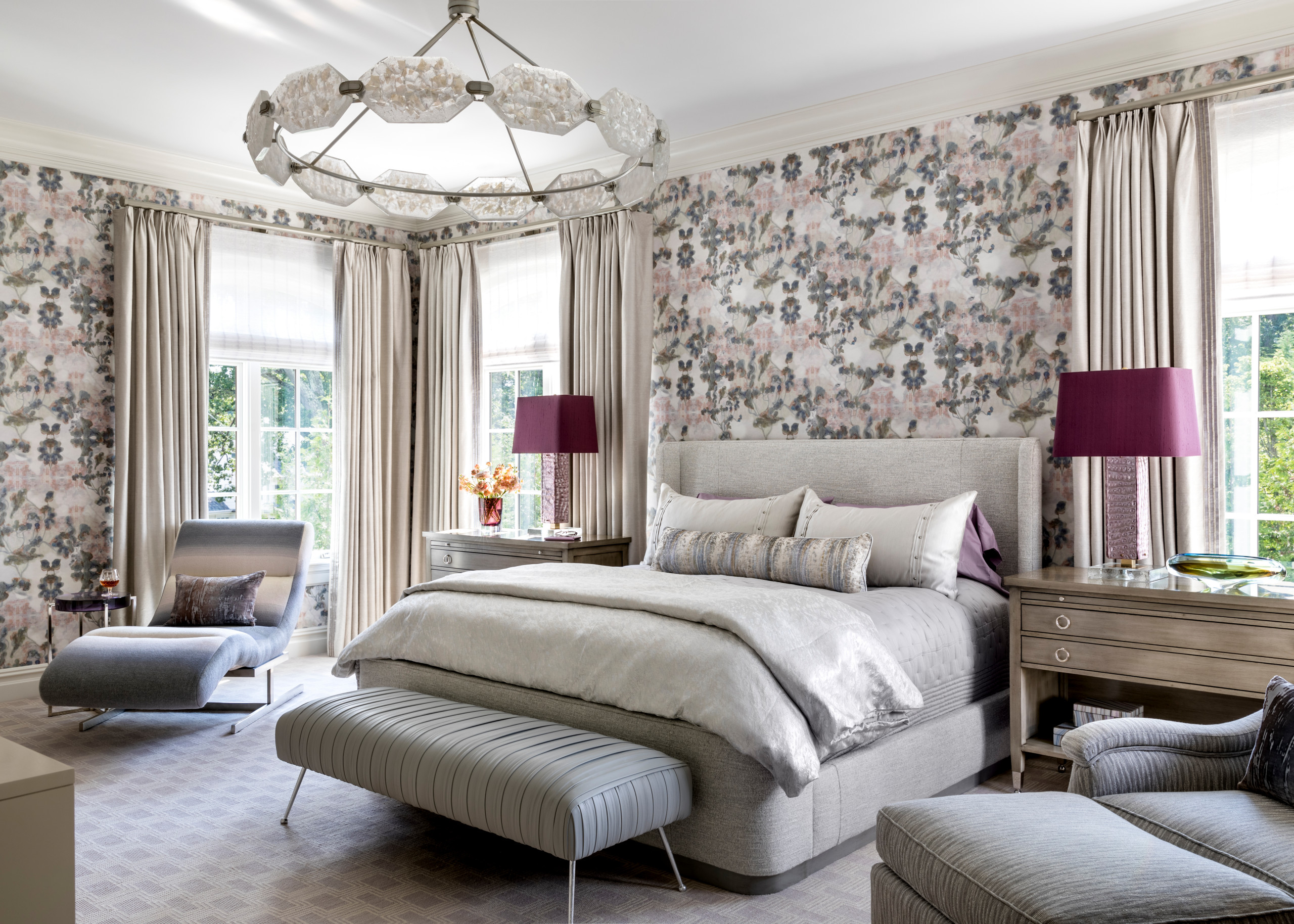 18. A subtly patterned wallpaper in this Denver bedroom by Andrea Schumacher Interiors joins patterned bedding, a patterned rug and bed frame for a luxuriously layered look.