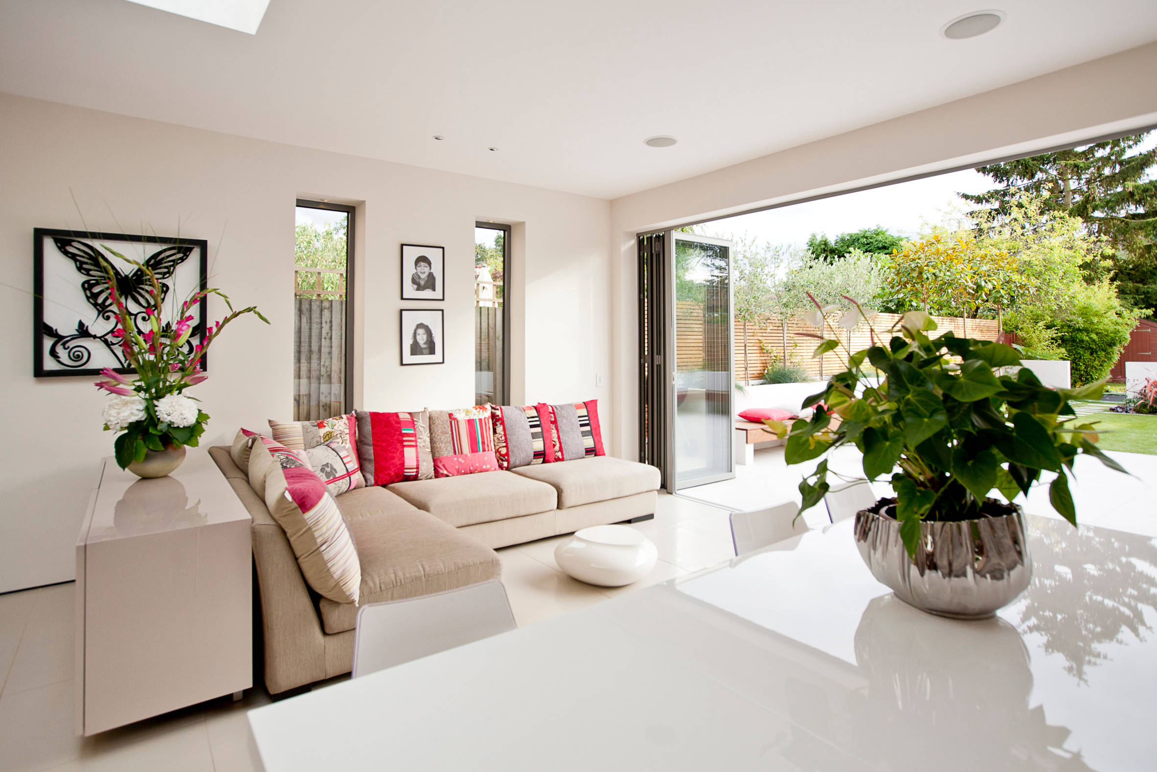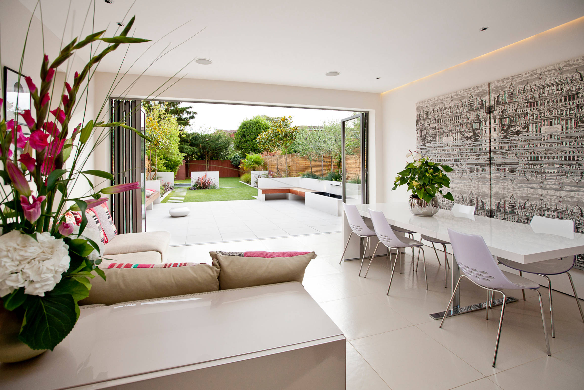 In this London home, a large glass door opens from the living-dining room to a same-level patio. The design brings views of the garden front and center, making a bottom-floor room light and bright.