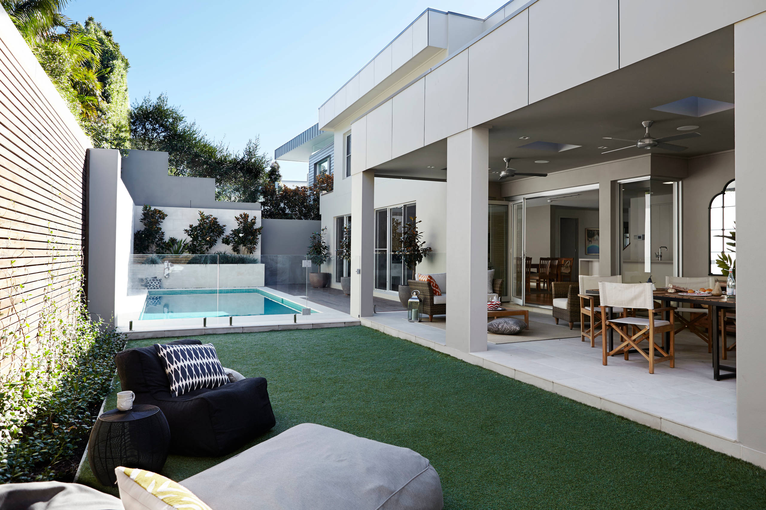 In this Sydney house, an expansive veranda is stocked with all the trappings you’d find in an indoor living room: lighting, ceiling fans, mirrors and plush outdoor furniture.