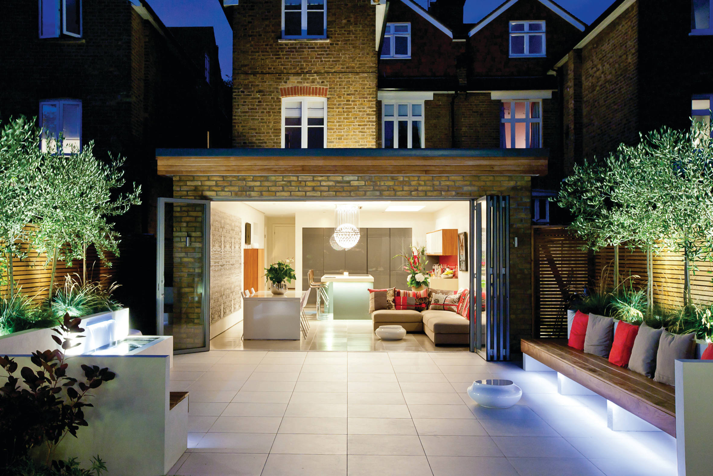 Here is the same house as seen from the garden. Outdoor lighting makes the patio inviting into the evening.