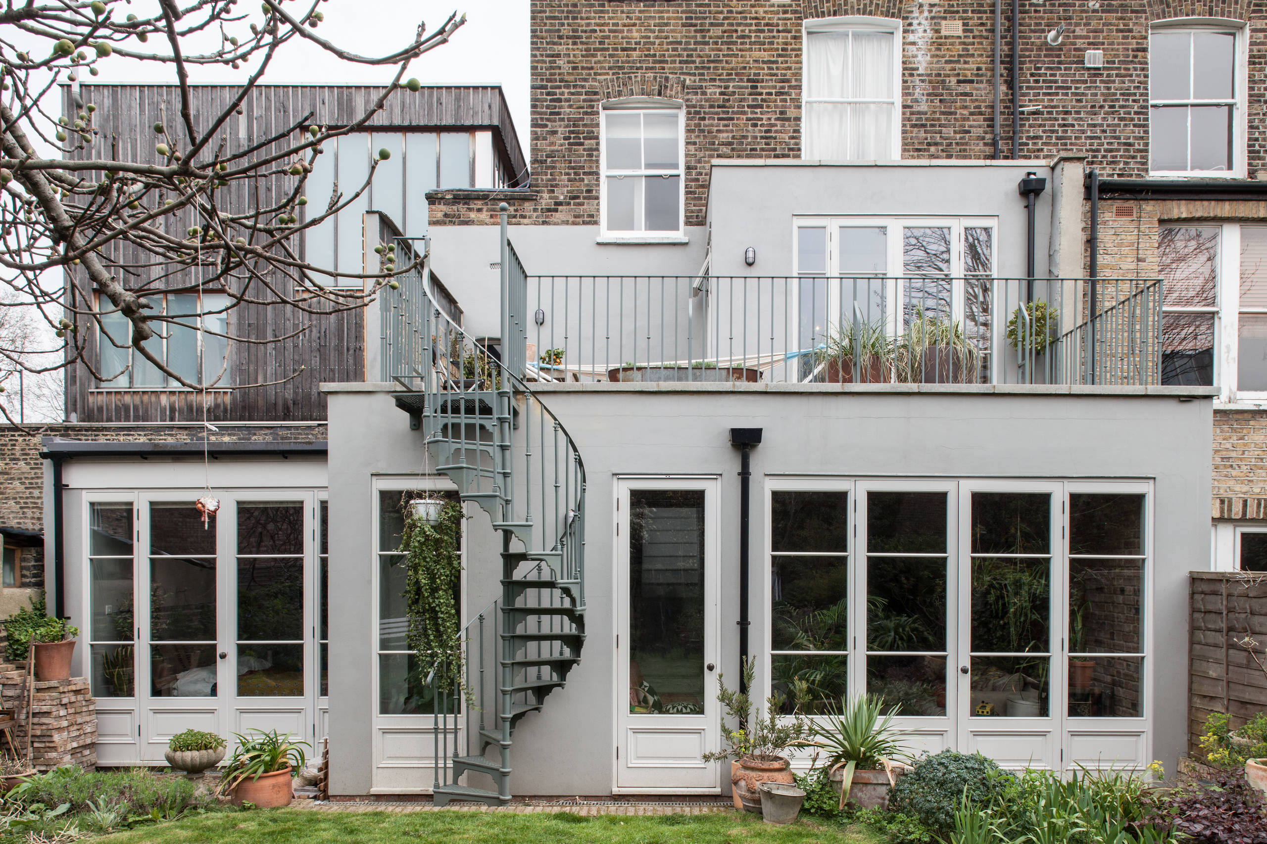 In this home in the Hackney area of London, French doors open to the garden and fill a new downstairs living room with light and fresh air. A cross-lattice ceiling creates the feeling of exposed beams, making the room even more open and airy.