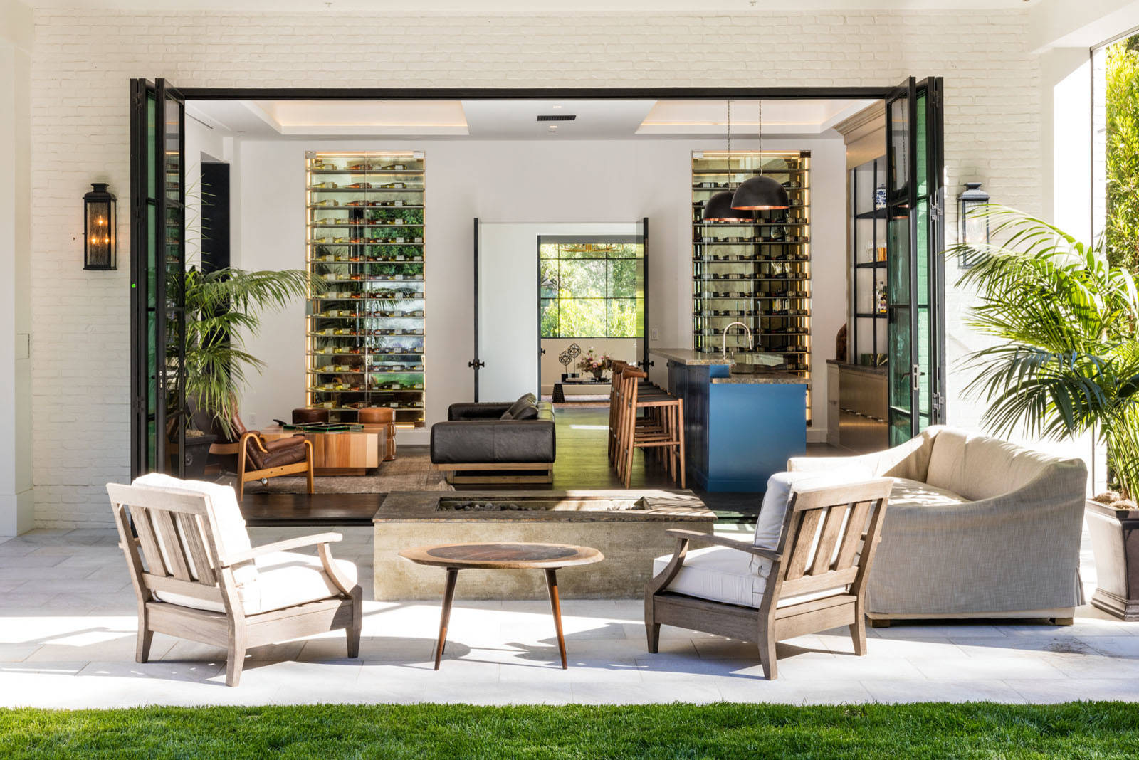 In this Southern California home, the large glass accordion-style doors can open completely to bring the outside in. The result is an easy flow from indoors to outside and the feeling of the living room expanding beyond the walls of the home.