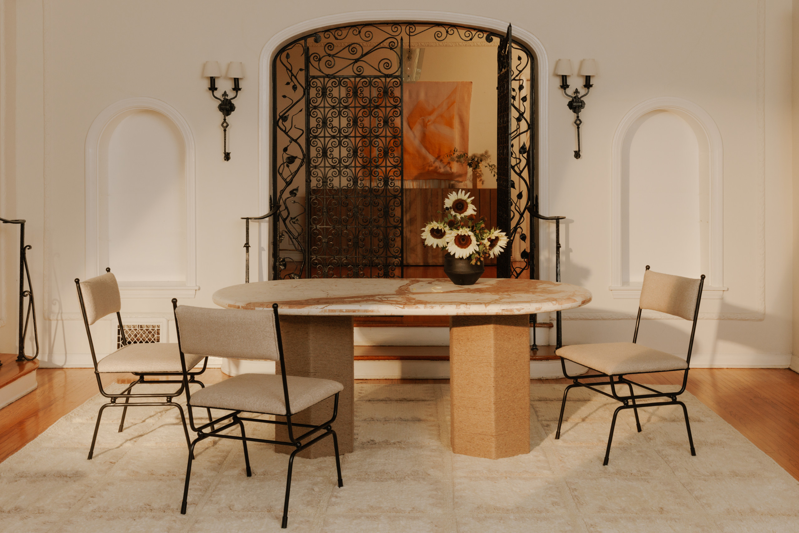 This arrangement of furnishings, which features the new, Italian-inspired Gillian Segal for Moe’s collection, includes Posta dining chairs with hammered metal frames and decorative finials. (Notice the warmly veined Italian Breccia marble top on the Sartoria dining table too.) Amber Lewis’ newest collection for Four Hands also had a variety of tables and a bed frame with textured iron and distressed bronze finishes, and we saw it at Made Goods too. It’s a classic stye, for sure, but it felt somehow new this season.