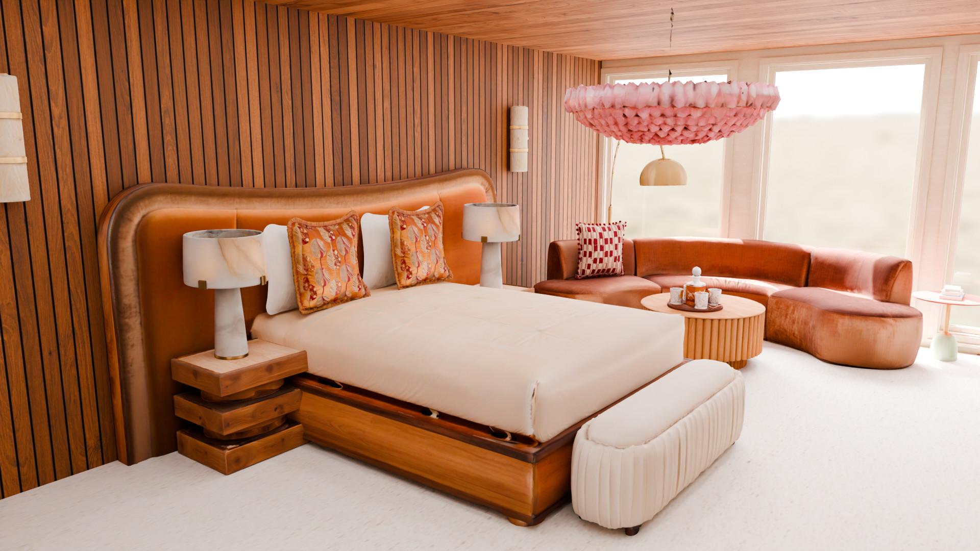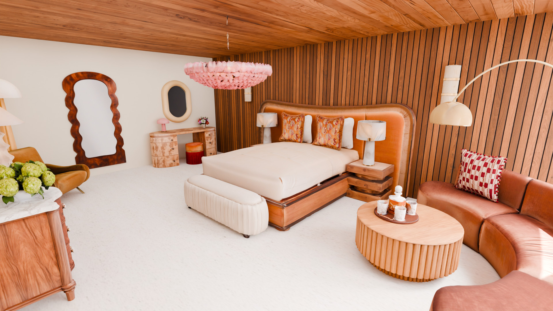 A wood-paneled ceiling flows into a wall of fluted wood paneling, adding depth and architectural character to the room. Rich walnut furniture and smooth neutral textiles complement the paneling, while sculptural lighting and a rounded headboard and sofa recall the organic shapes and craftsmanship of the era. The crystal whisky decanter on the coffee table, meanwhile, is both a refined detail and a subtle reference to the characters’ predilection for indulgence. When exploring the room, you’ll also find velvet drapery pulled to one side of the floor-to-ceiling windows — an allusion to the show’s controlled appearances and concealed truths. Combined, these elements create an homage to the show and to midcentury modern design that feels both fresh and sophisticated.