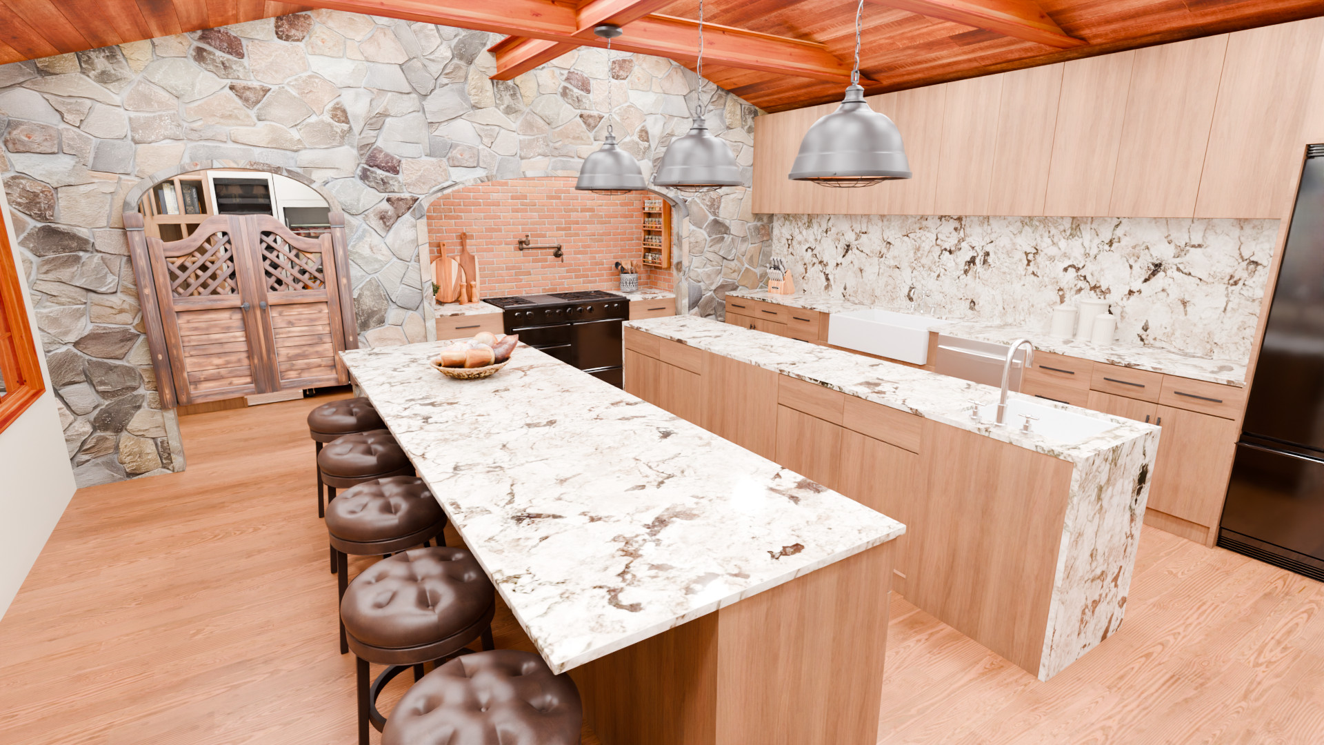 The large, luxurious space has stone-clad walls, exposed beams, two islands and dramatically veined countertops. The rugged Montana landscape is even visible through large windows, which can be admired when exploring the space in the Dollhouse and life-size Walkthrough views.