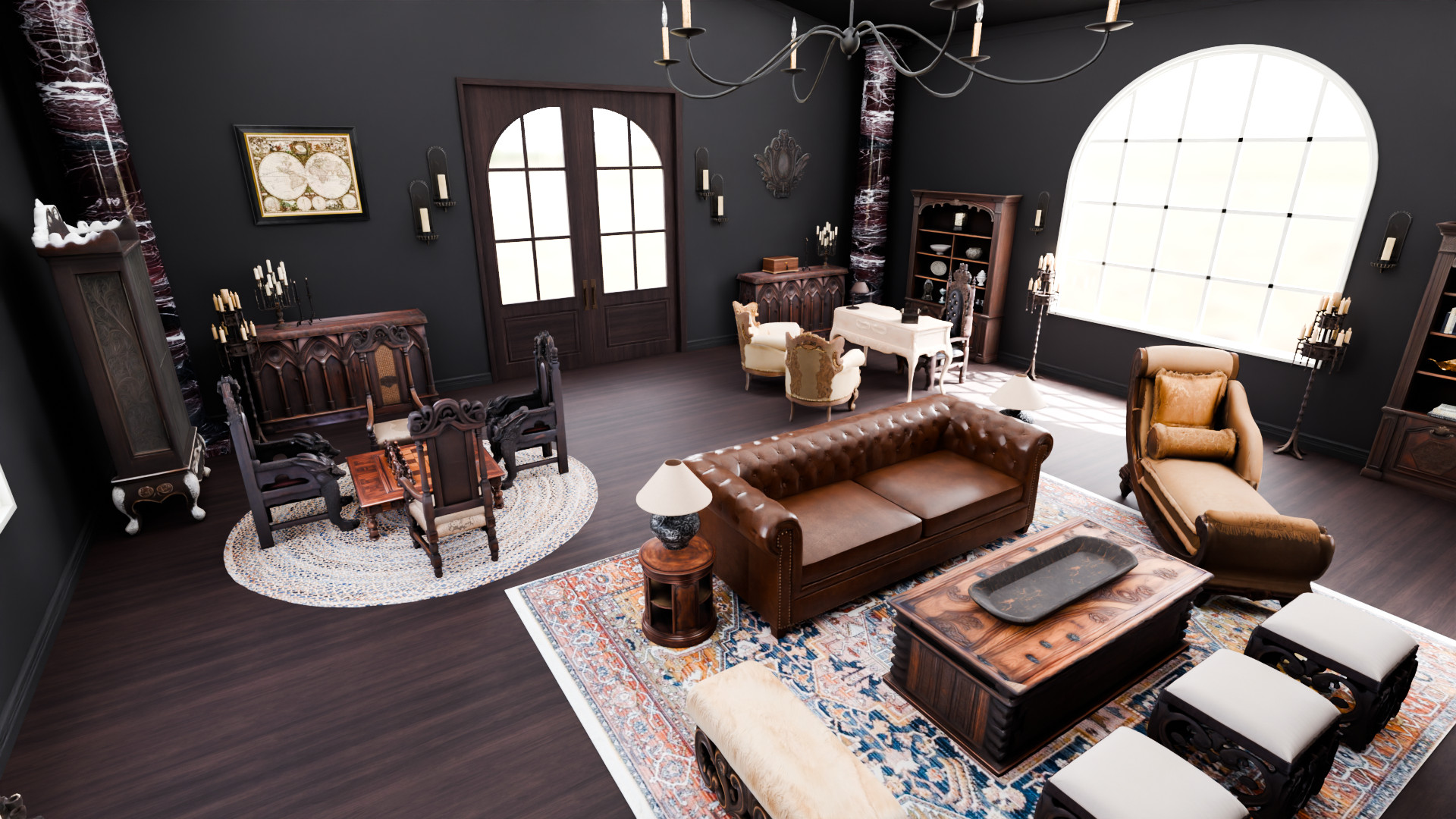 Azelia Dickson, principal designer at Utah-based Interiors by Design, calls the room’s moody look Medieval Fantasy Grandeur. To create its balance of drama and livability, she paired dark color-drenched walls with towering arched windows that flood the space with light. A massive marble fireplace framed by polished stone columns anchors the room, and an ornate desk serves as the focal point for the “throne.” A carved wood table set for chess hints at counsel and strategy, while decorative elements such as wrought iron chandeliers, candelabras, gilded accents and heavy drapery amplify the sense of royal gravitas.