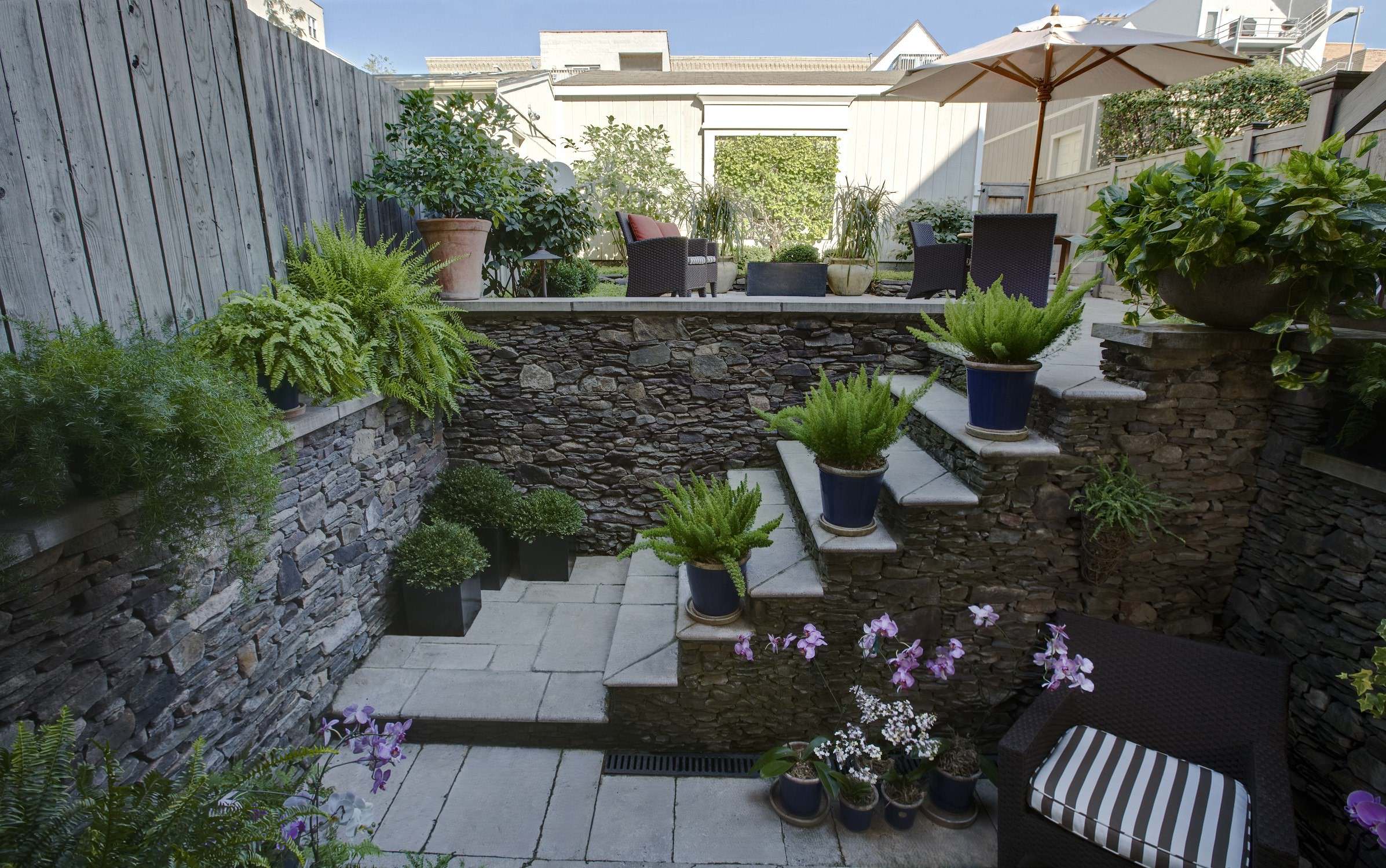 The compact new backyard is an inviting space with a lovely dining and conversation area off the main floor of the home. The steps, seen here, lead to a cozy getaway spot by the basement entrance.