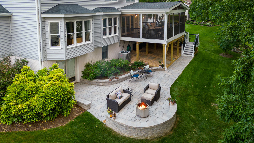 Challenge: Colin Breme of Core Outdoor Living had an almost clean slate when designing a new screened porch, deck and patio for this Fairfax, Virginia, home. “All [the homeowners] asked for was that the final product was open and airy,” he says. (Here we see a “before” photo of the space.)