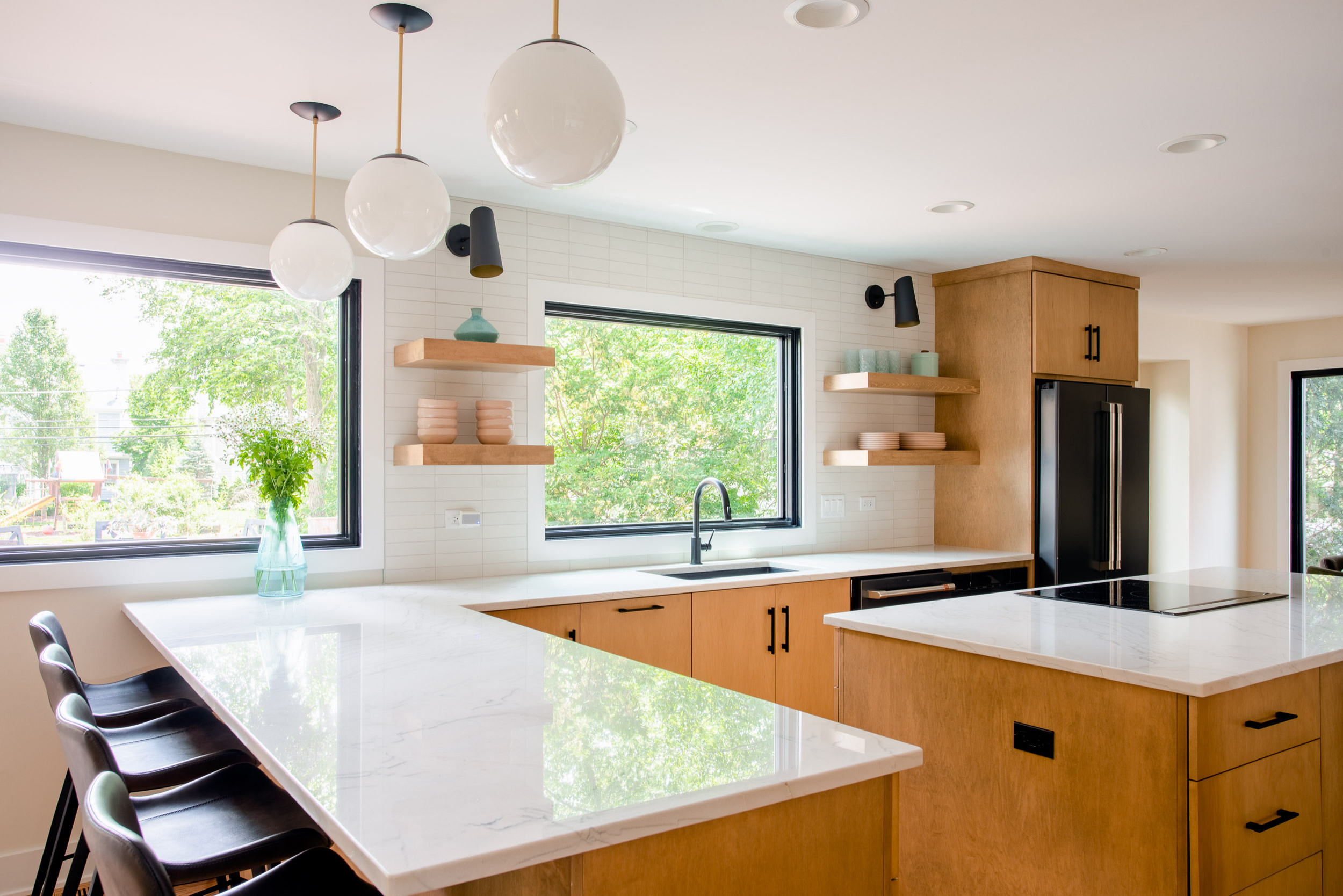 Other special features. “I love the honed cement light-gray wall tile used and installed in a horizontal stacked bond, tying in with the natural textures and modern design,” Butler says. “We used black-and-gold globe pendants above the peninsula and wall-mount sconces above the floating shelves to add accent lighting.”