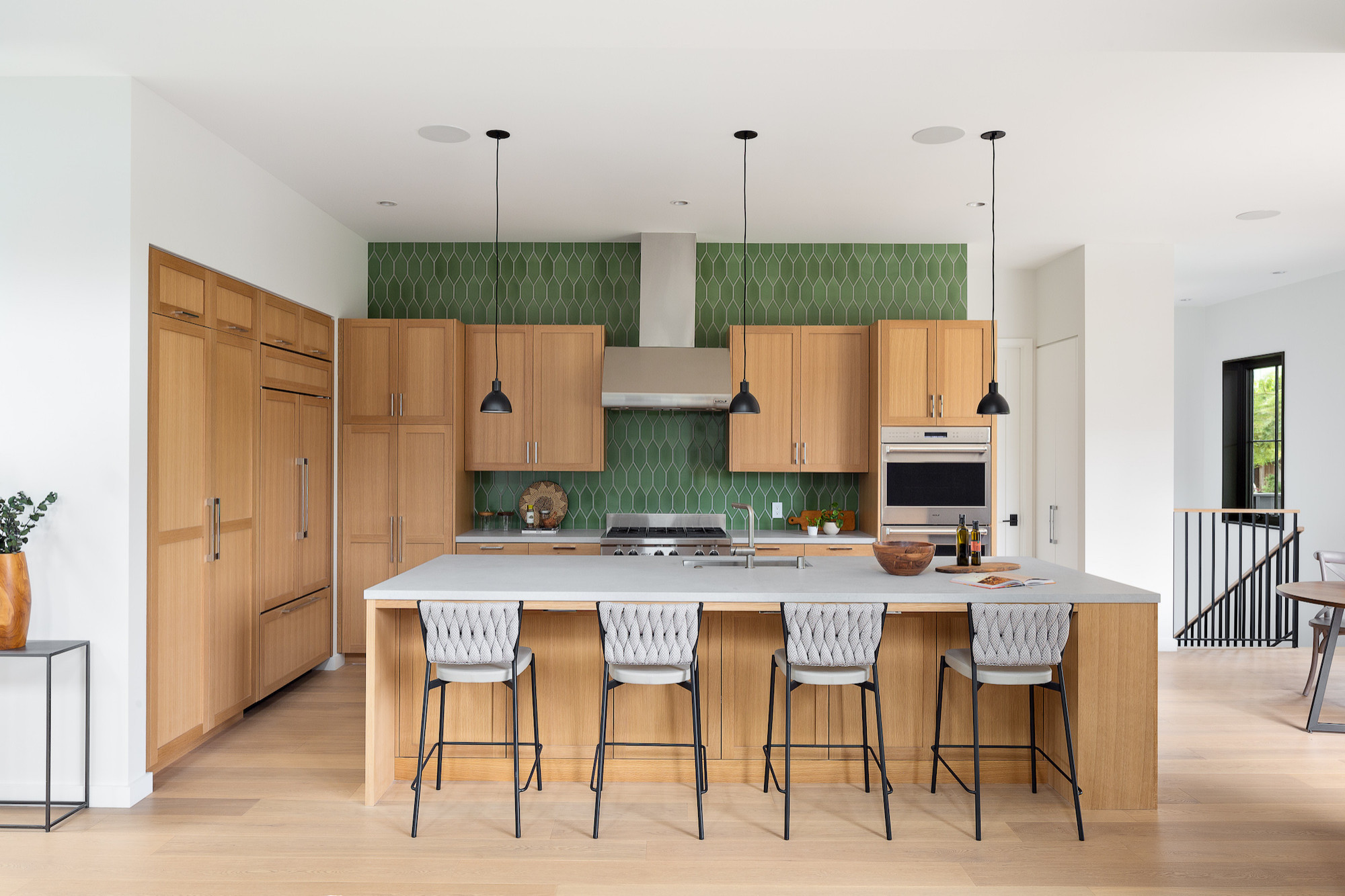 Wood cabinets. Shaker-style quarter-sawn white oak. “The cabinets and floors provide a warm, natural palette, and the green picket tiles reflect an abstraction of leaves,” Walters says. “The Shaker-style cabinets reflect a more transitional cabinetry design, but the uniformity of the quarter-sawn oak adds a touch of modernity. White painted walls with a smooth finish contrast with the natural wood finishes and further enhance their beauty.”