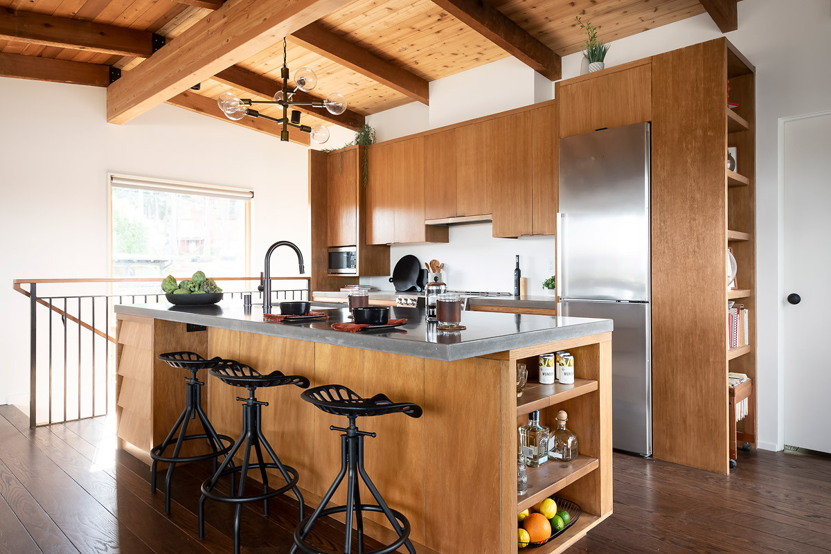 Wood cabinets. “Our solution was to disassemble the old meranti cabinet faces built in the ’60s by the client’s father, piece by piece, and repurpose all of the faces into what is now the new, custom island,” Murphree says. “We then matched new white oak plywood to the old meranti plywood to build all of the cabinets on the wall. Last, we demolished the drop ceiling and restored the cedar planks, and we poured and polished custom concrete countertops on-site. The result is a fresh mix of old and new cabinets with a bright, new, modern face.”