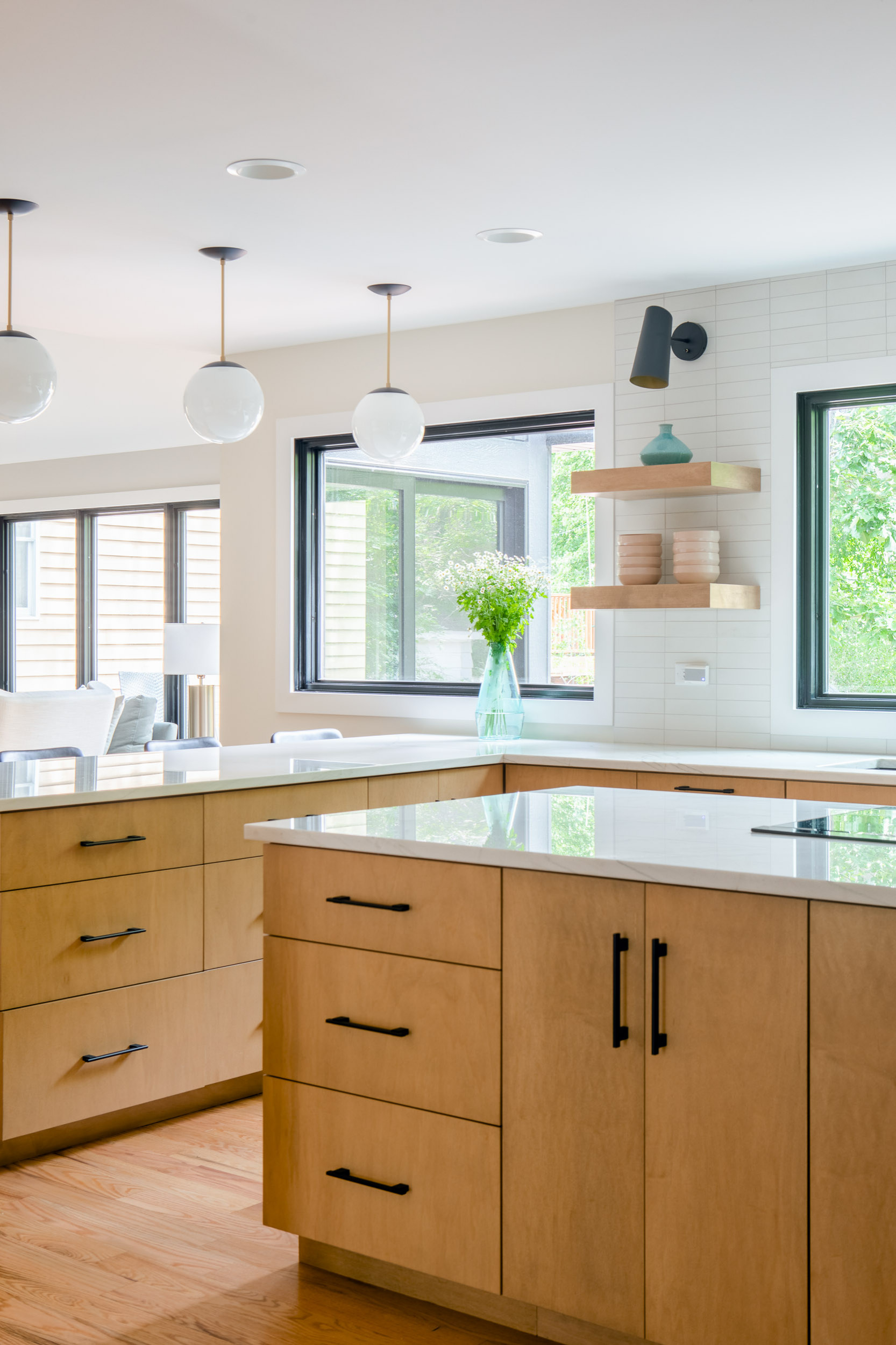 Homeowners’ request. “The vision for this kitchen was to create a light, streamlined and modern open-floor concept space with touches of natural warmth brought in by wood flooring and wood cabinetry,” designer Anna Butler says. “The client wanted more light in the space, which was achieved by knocking down the wall separating the kitchen and dining area and by adding in the large picture windows.”