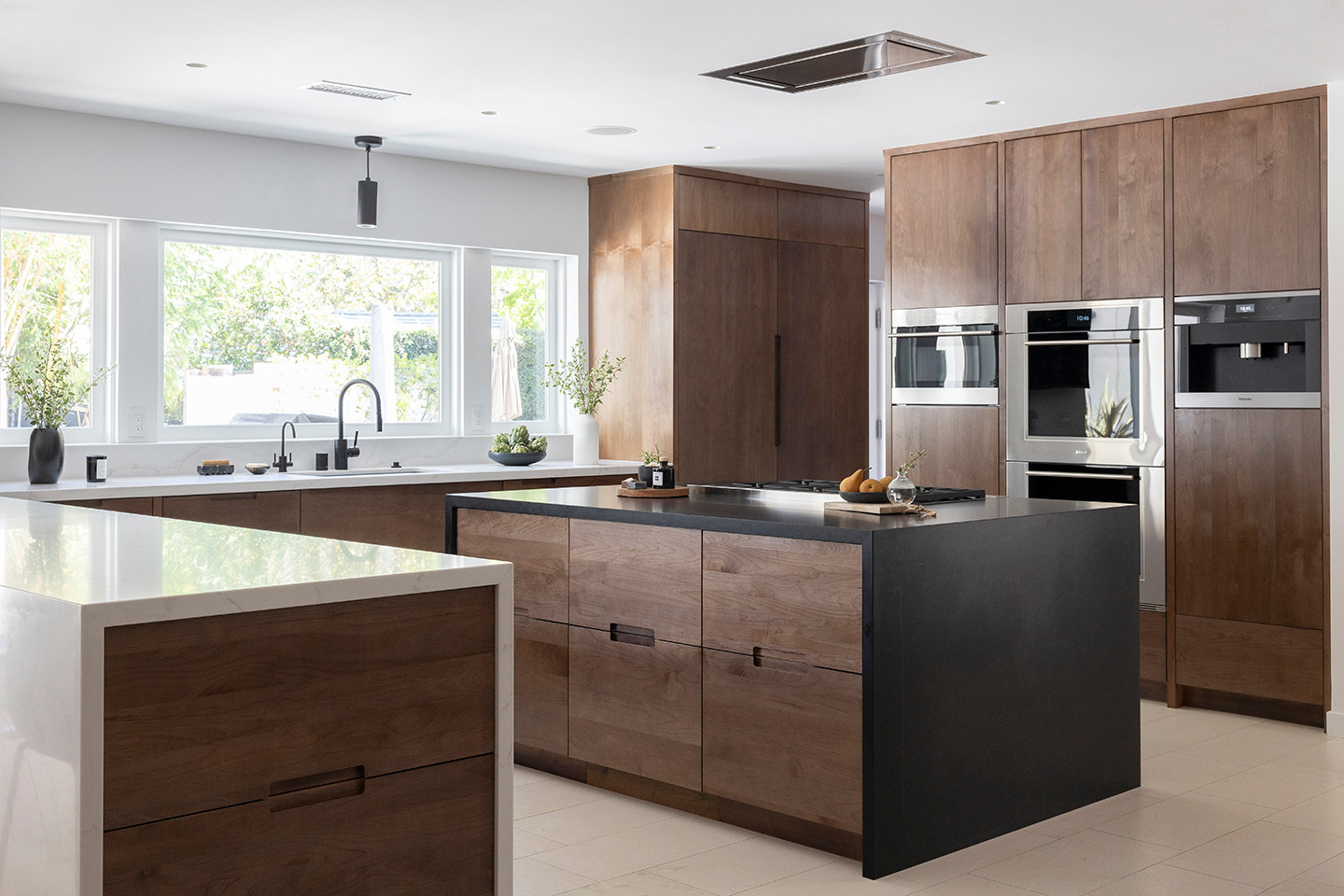 Other special features. The island countertop is matte black quartz; the perimeter material is marble-look quartz. “The black sink made for an unusual statement piece instead of a traditional white sink,” designer Leonardo d’Anconia says. “It allowed us to continue the black-and-white tonality of the kitchen that let the wood stand out even more. There are no other colors in the kitchen other than black, white and natural wood tones.”