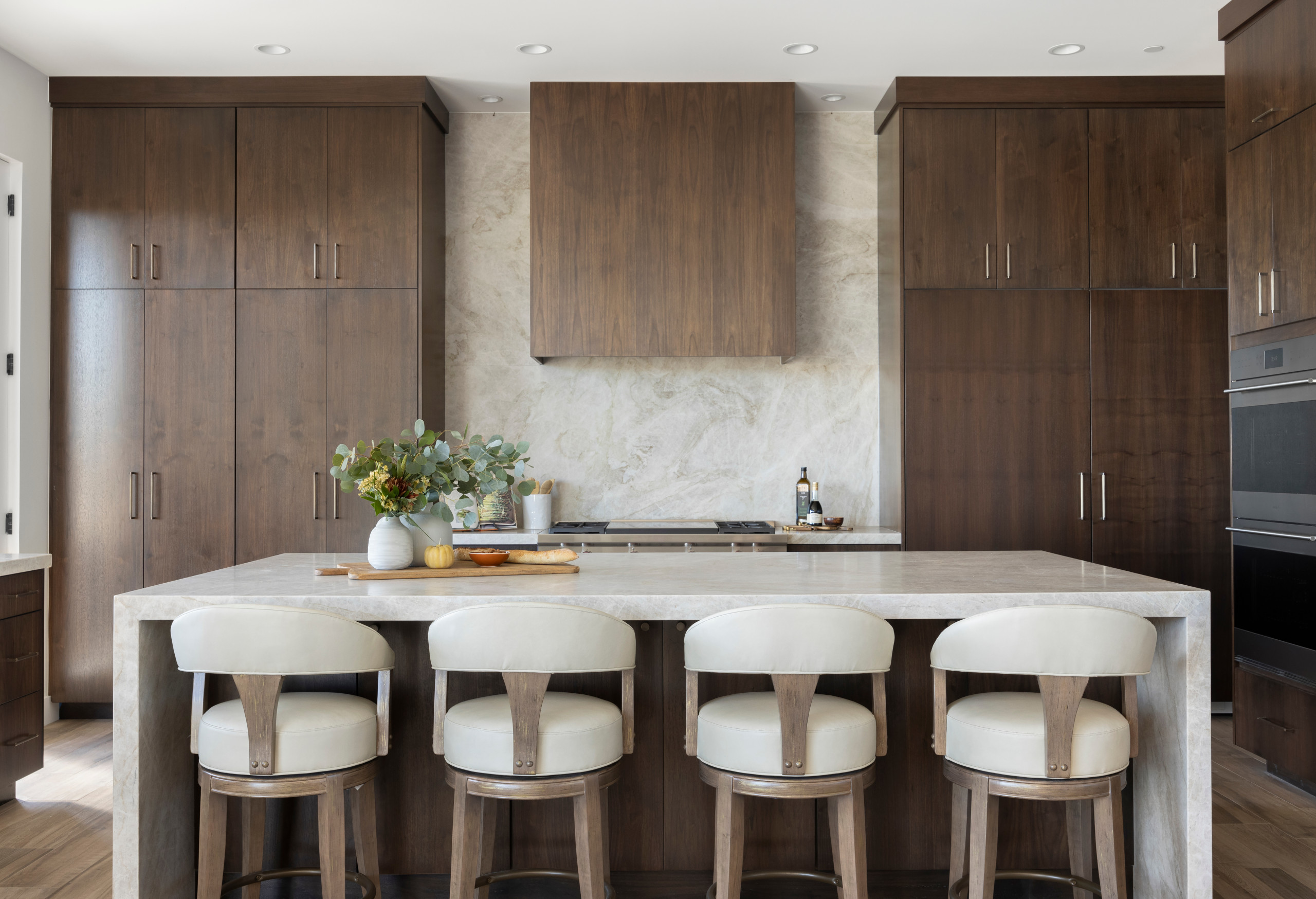 Other special features. Marble-look quartz countertops and range backsplash. Glazed white terra-cotta backsplash tiles. Double gooseneck spout faucet in burnished brass. “On the left, an extra wood seating section adds an unexpected touch of luxury,” Sharp says. “An inviting spot to enjoy breakfast in a beautifully designed setting.”