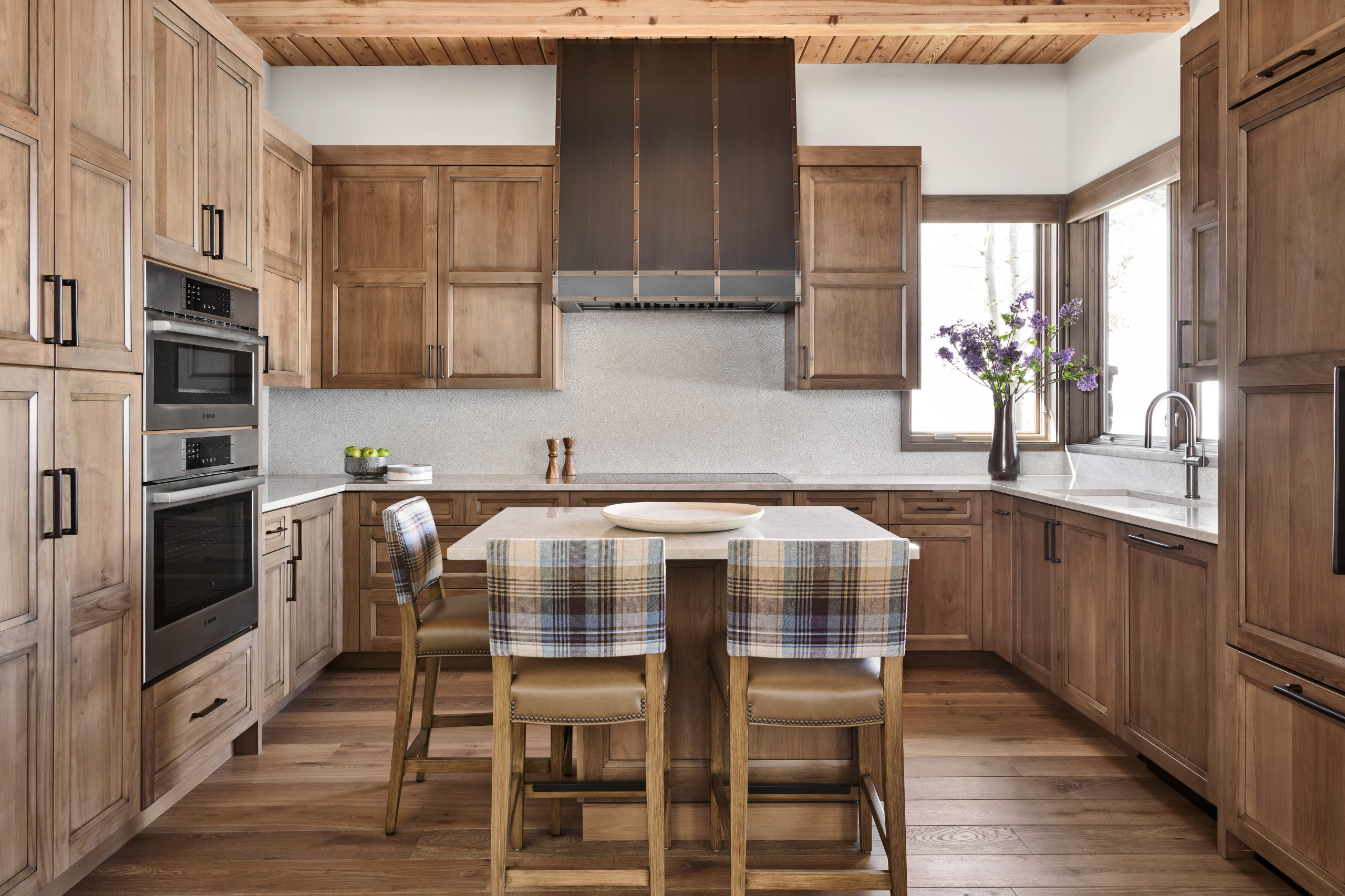 Wood cabinets. Alder. “The client wanted a mountain feel, and it had been agreed to keep the wood ceilings and to media blast them to freshen the look,” Grice says. “This rich alder wood we carried throughout on all of the doors, trim and some of the cabinetry. The light, warm-veined Taj Mahal quartzite countertops and stone mosaic backsplash give a soft contrast to the wood. The hammered copper hood added to the warm mountain vibe. ”