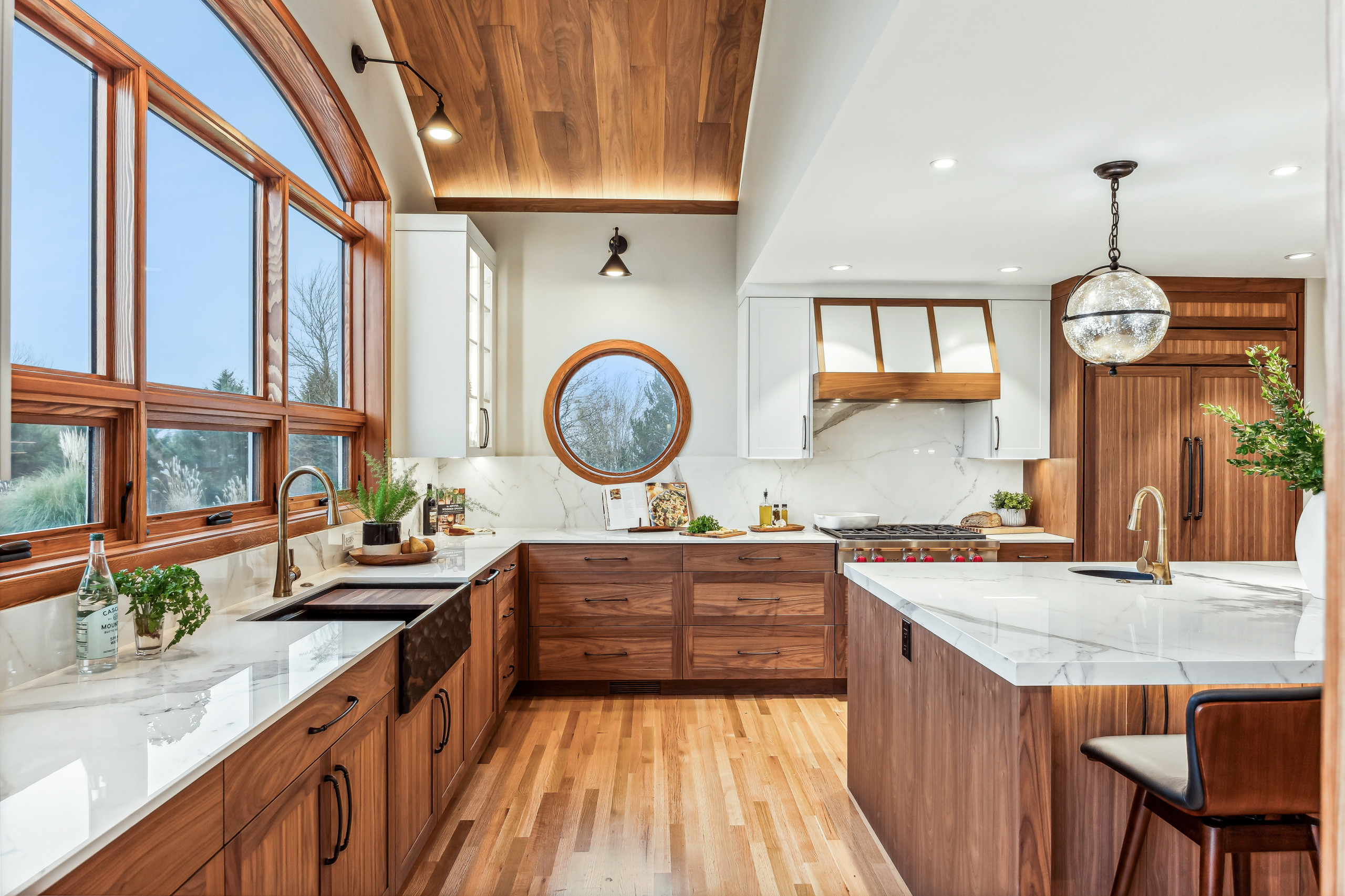 Other special features. “We crafted the addition with a stunning barrel ceiling adorned with rich walnut wood paneling and accent lighting, creating an inviting atmosphere,” Moore says. “After careful consideration, the clients chose the more intricate design, perfectly complementing their home’s aesthetic. To elevate the space, we added a round window and an arched window in the kitchen, enhancing its character.”