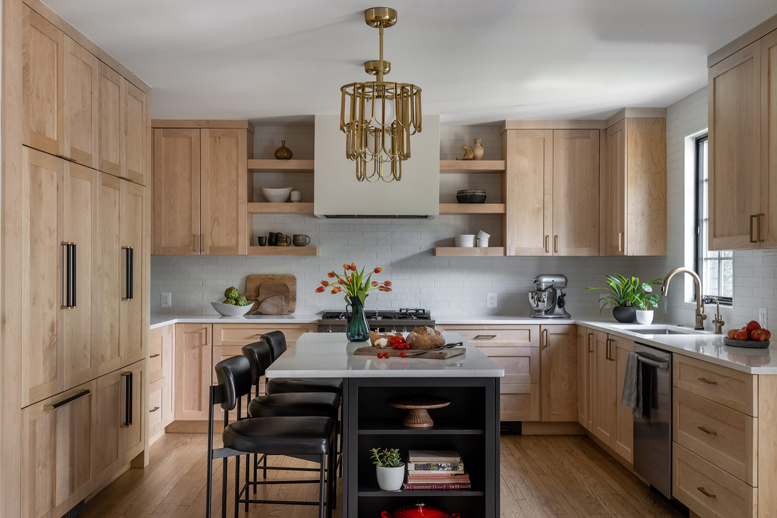 Wood cabinets. Natural maple wood cabinets in a matte finish. “They wanted their kitchen to feel bright, warm and cozy, while also introducing some industrial elements for contrast,” Nyce says. “We worked with the concept of using a lighter tone around the perimeter, paired with darker accents on the island, hardware and other details. The house facade featured black-painted brick, and [the homeowners] were keen on incorporating this dark color into the interior details. By integrating natural maple matte wood cabinets along the perimeter with a white brick-look tile backsplash, we achieved the perfect balance of cozy and industrial. The island, painted in Sherwin-Williams Tricorn Black, stands out against the lighter backdrop and provides just the right amount of darkness they were looking for.”