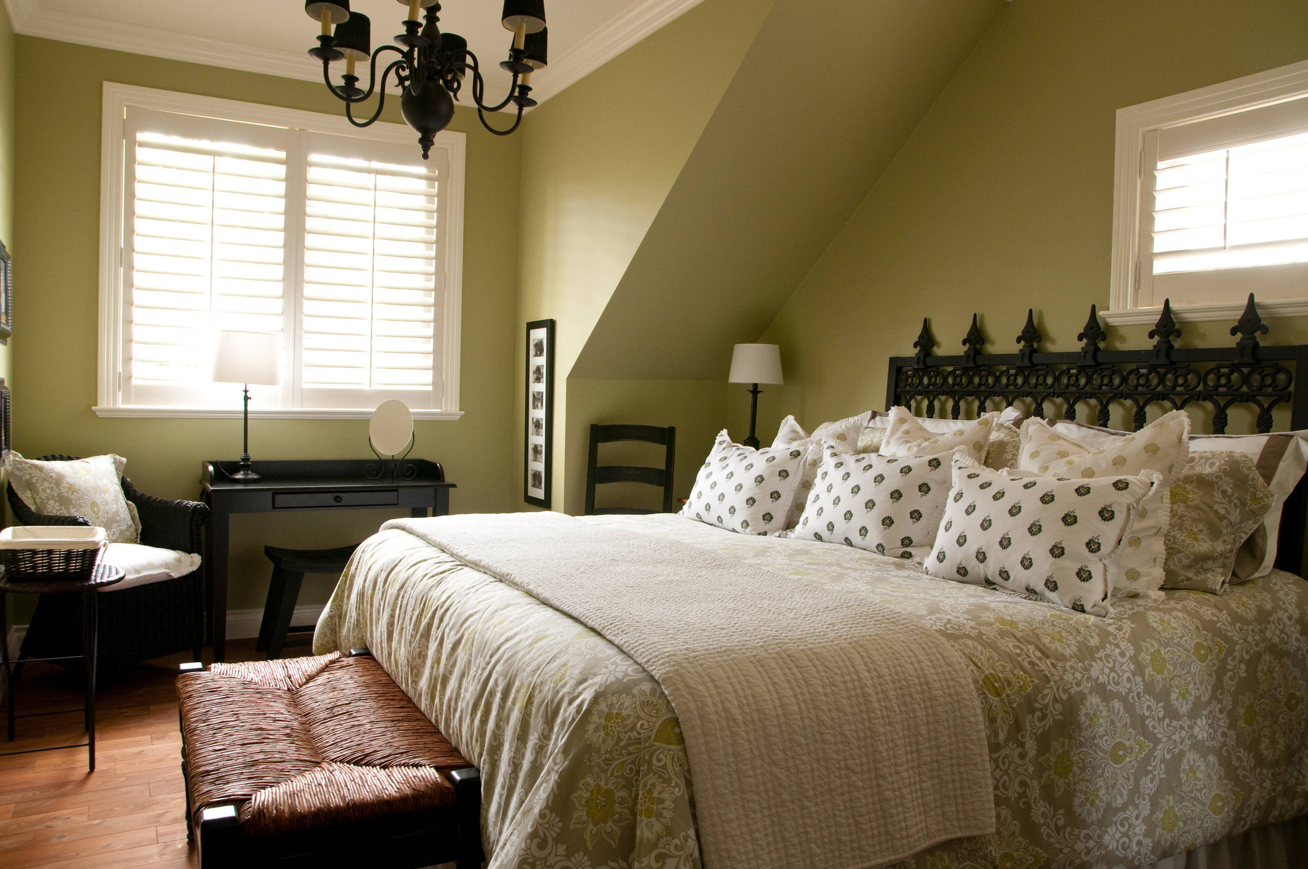 This lovely guest room painted by Warline Painting in Benjamin Moore's Georgian Green will be remembered over a similar one painted Builder Beige.