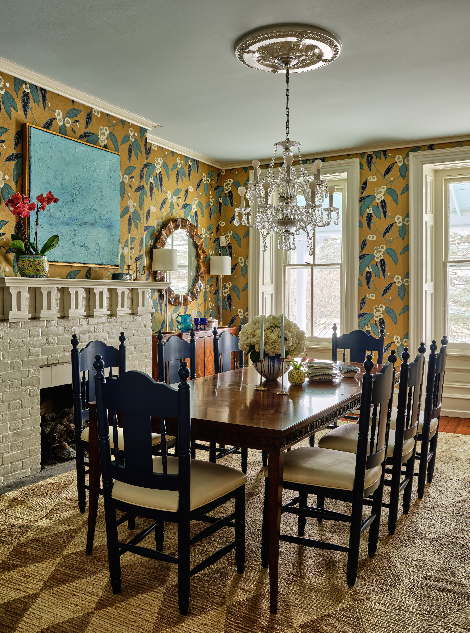 Wallpaper: Coppice in Navy/Lagoon/Gold, Harlequin; dining table: Spencer, Woodbridge Furniture; chairs: Nantucket in Blueberry and Tusk, Redford House; rug: Harwich hand-woven jute, Annie Selke