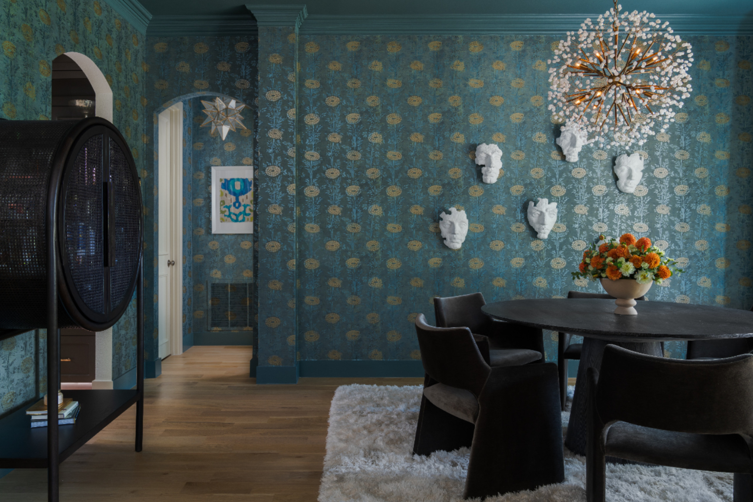 Special features. “A cerused oak dining table with a distinct textured grain is complemented by dark chocolate velvet dining chairs, which have a luxurious sheen and dense soft pile, reflecting light in all directions,” Withey says. “A wallcovering with gold marigolds over a blue-green background offers an enchanting design that injects a vibrant energy into the space. A luminous 12-light chandelier finished in gold leaf features an explosion of quartz crystals that cast shadow patterns across the dark painted ceiling and the patterned wallpaper, creating an additional feature to be enjoyed.”