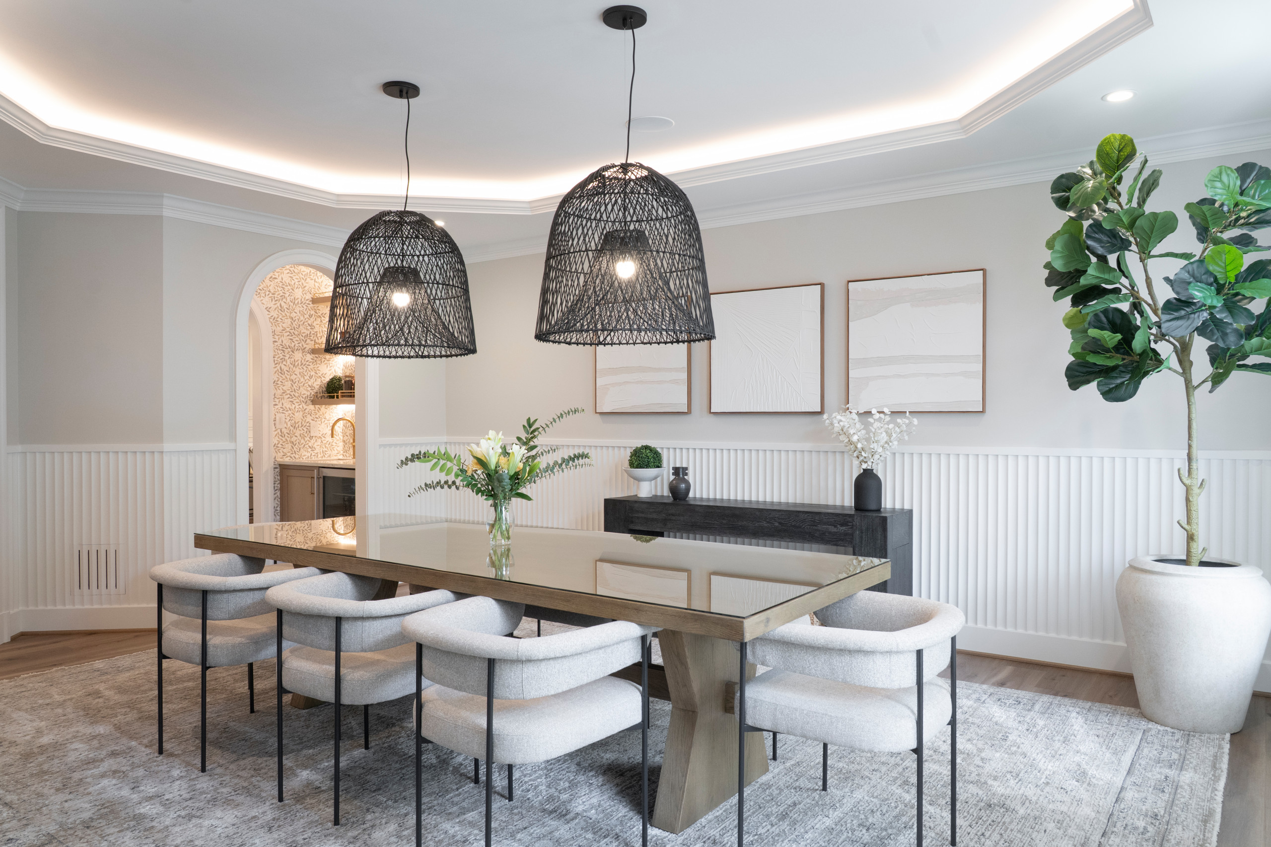 Special features. “We chose to highlight the existing octagon tray ceiling — once a design element the homeowners didn’t love — by adding LED tape lighting to modernize and emphasize its geometry,” Frush says. “Below the chair rail, we continued this updated aesthetic by replacing traditional picture frame molding with fluted paneling, achieving texture and interest while avoiding drywall repairs. To tie in the home’s architectural details, we echoed the arch top windows by reshaping the butler’s pantry entries into archways. Finally, we split the existing ceiling rough-ins to accommodate two oversized woven black rattan pendants, adding drama and warmth to the dining area without making the space feel overly formal.”