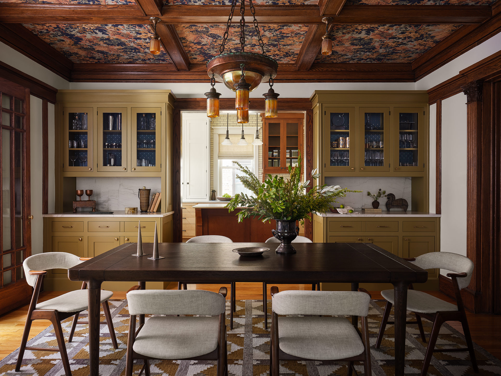Special features. Wallpapered ceiling in botanical paper. Built-ins painted in Olivetone by Benjamin Moore. Upper cabinets backed in geometric wallpaper. Vintage dining chairs reupholstered in family-friendly fabric. The light fixtures are antique and original to the home. The millwork is also original.