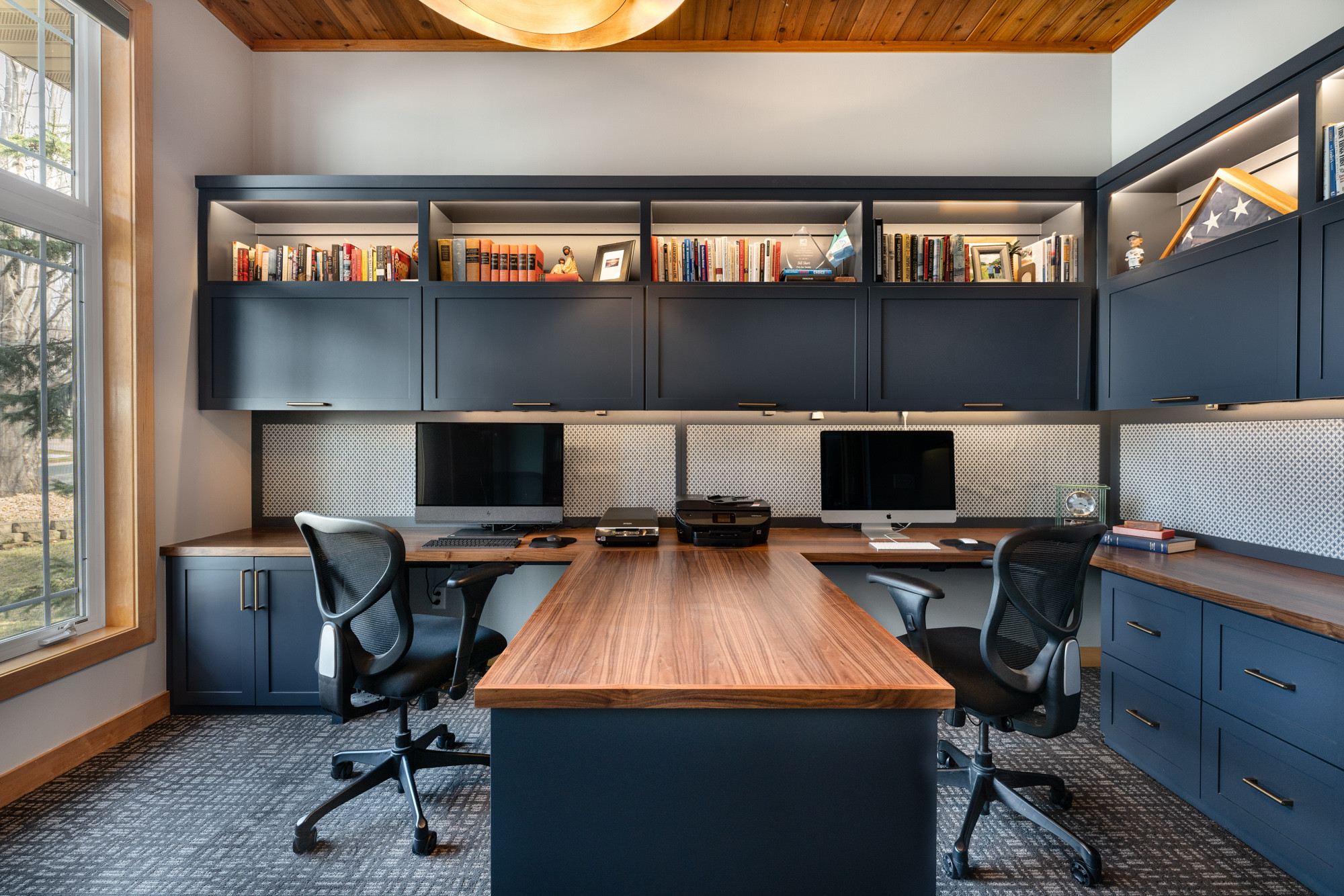 Main feature. A walnut-topped desk allows two people to work at the same time. Dark blue built-in cabinets combine file drawers, flip cabinets and open display space. “This office is located right off of the front entry, so things had to be stylish and give the owners the ability to put things away,” design-build pro Greg Alsterlund says.