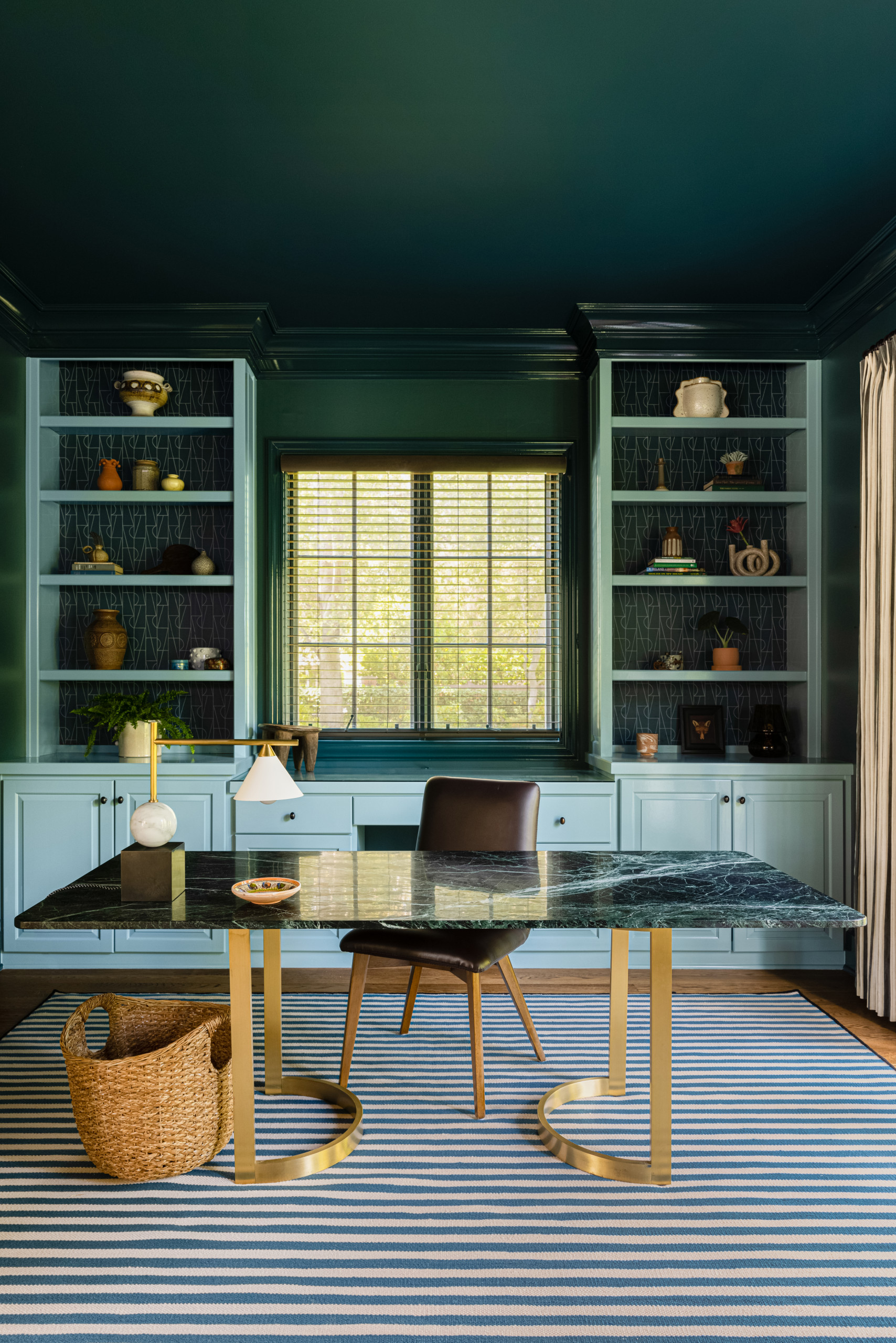 Main feature. Kramer painted the built-ins a custom color matched to the light-colored pattern in the wallpaper that she used to back the open shelves. She then used the darker base color in the same wallpaper to create a custom color to paint the walls and ceiling. “This room envelops you upon entering and is the perfect place to work and tackle to-do lists,” Kramer says.