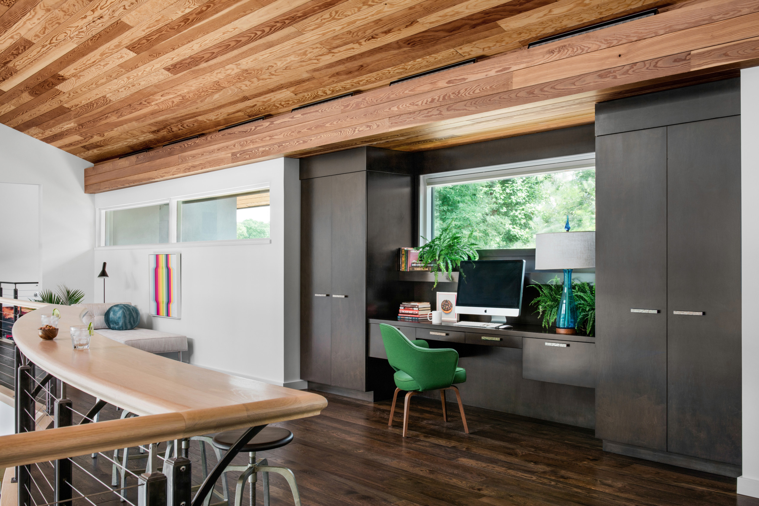 Other special features. Custom dark-stained built-in cabinets. Saarinen executive armchair upholstered in palm green fabric. Turquoise lamp. In a nearby corner, a chaise lounge offers a spot to kick back.