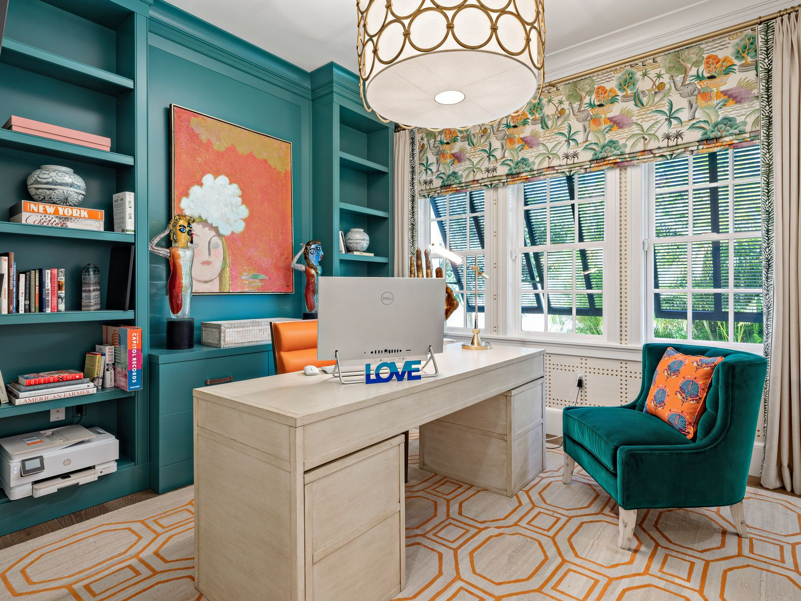 Main feature. A botanical print Roman shade kicked off the orange-and-green color scheme. High-gloss green built-ins (Very Green by Benjamin Moore) complement a rich velvet side chair. Orange geometric shapes in the custom rug coordinate with an orange leather desk chair and other orange details.