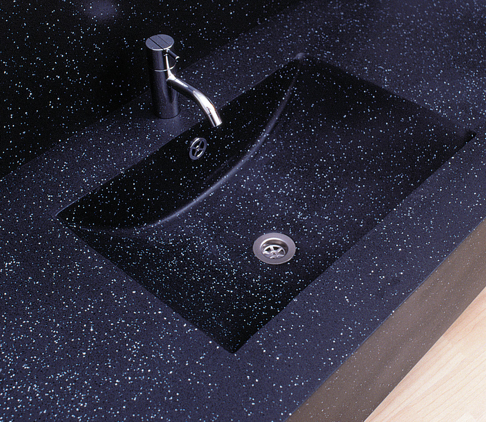Look and feel. This countertop material comes in nine finishes and a range of colors. Finishes range from smooth and velvety to a rugged look that emulates natural stone. The material can work within transitional, modern and minimalist design styles.