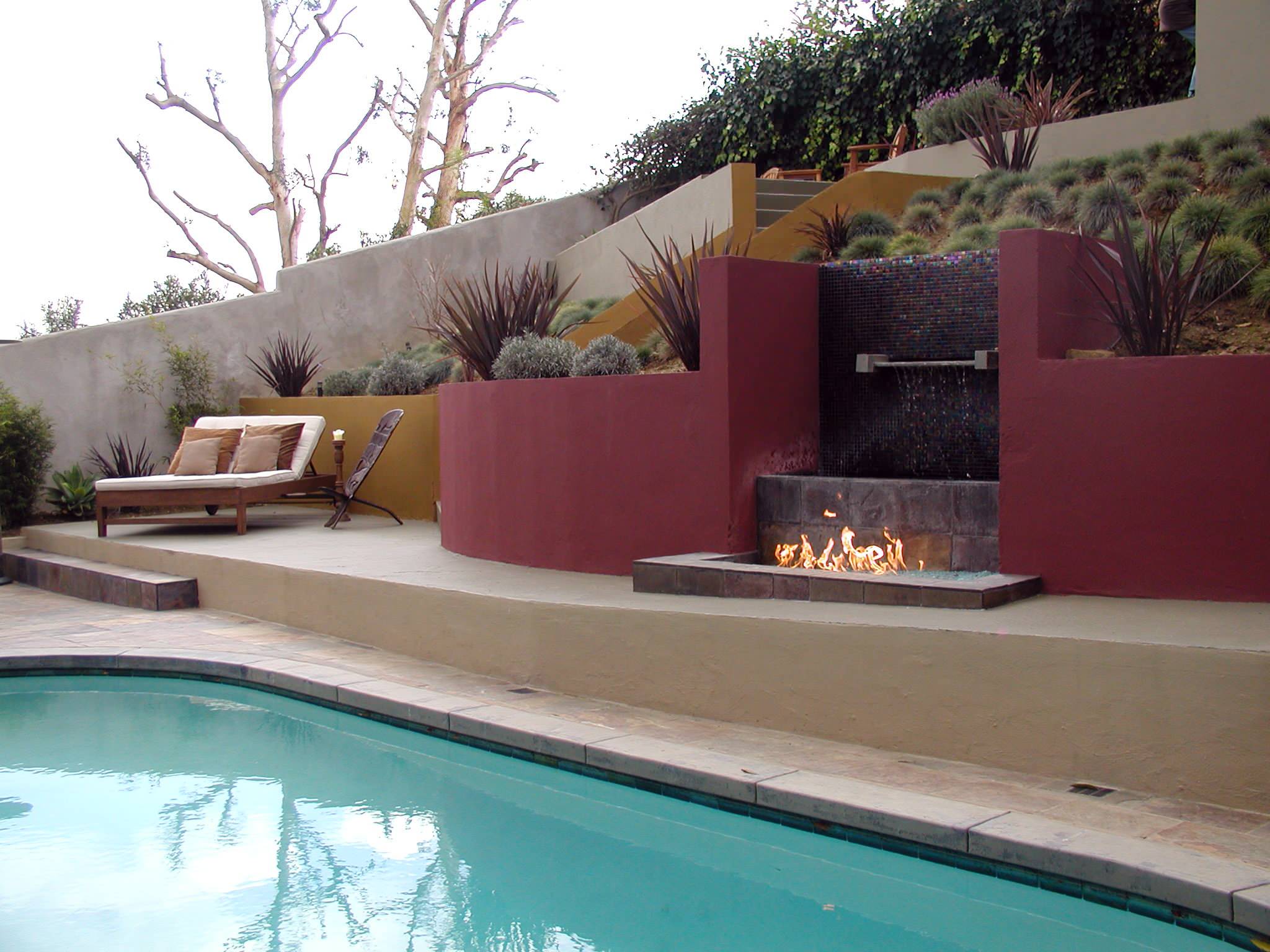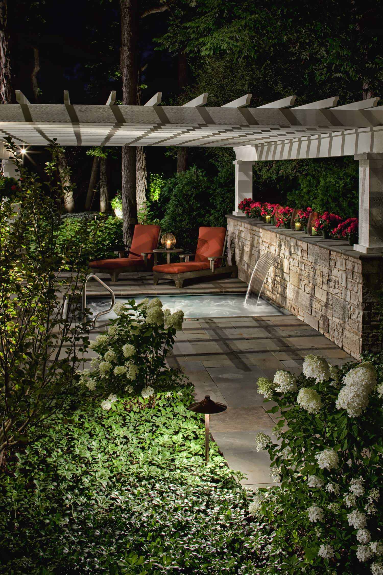 This water and fire feature stands out dramatically as a focal point — thanks, in great part, to its color. Red is the strongest color in the landscape because of its high contrast to green. (They are opposites on the color wheel.)