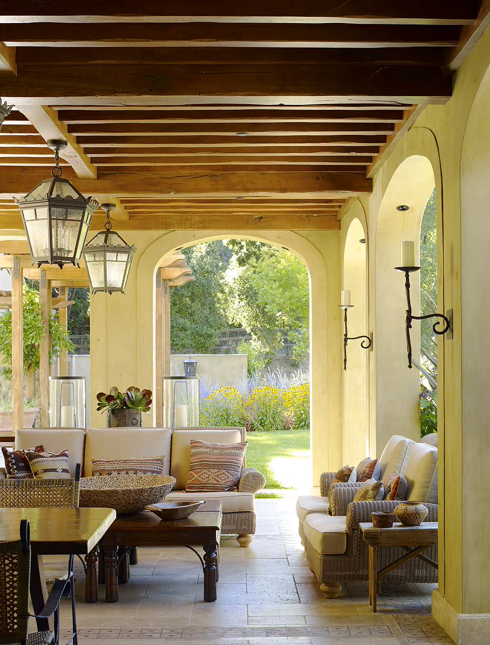 The soft yellow light of this outdoor room makes it warm and inviting. The living space is visually expanded by showcasing a yellow flowery planting at the end of the framed vista.