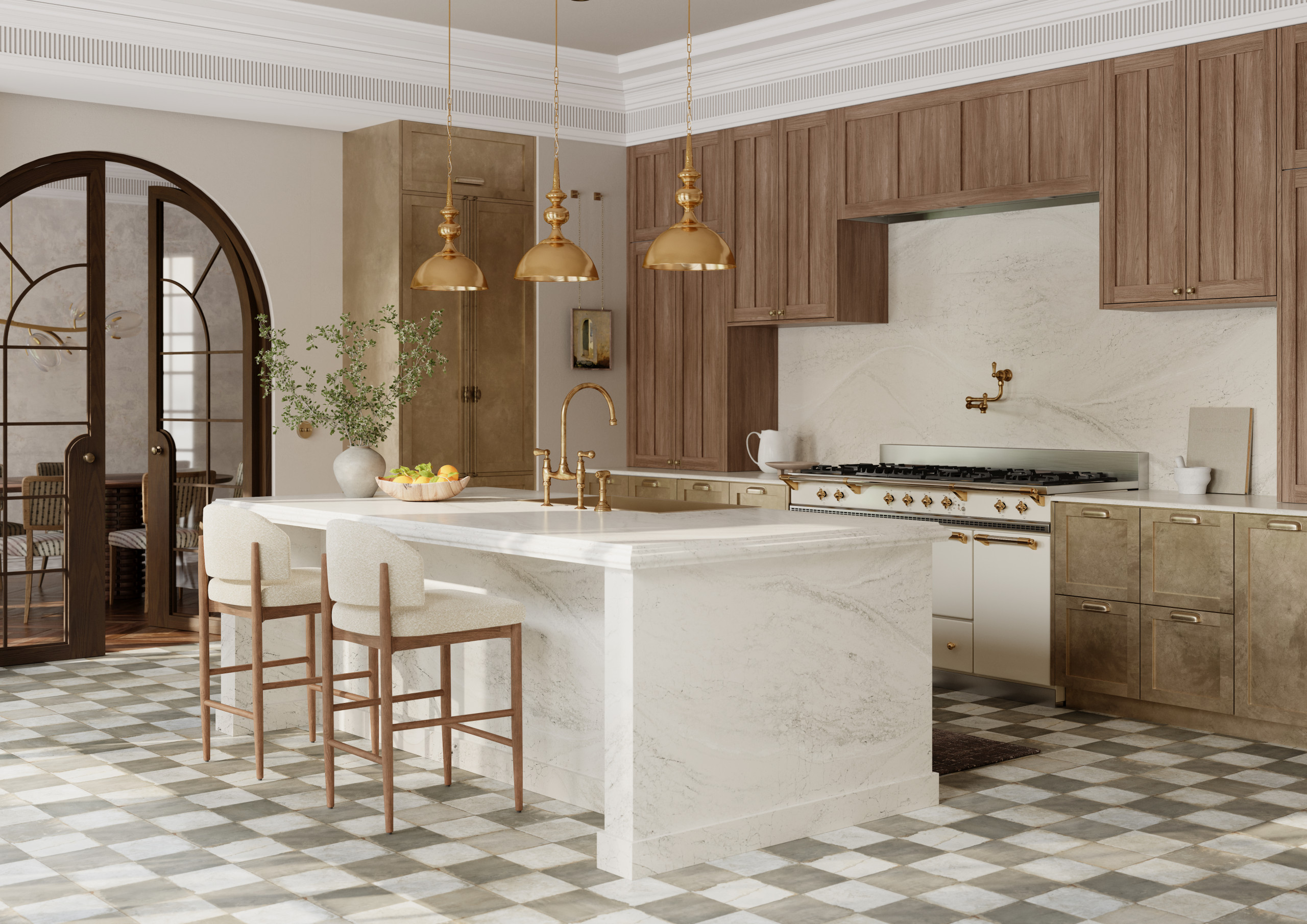 Warm neutrals are leading 2026 designs for countertops and other surfaces. Creamy off-white backgrounds layered with veining and markings in taupe, beige, sand, chocolate, brown and soft gold create soothing, welcoming surfaces. Paired with natural wood tones, these offerings bring warmth and approachability to kitchens, baths and other spaces, moving away from the stark feel of the bright whites and cool grays that once dominated.