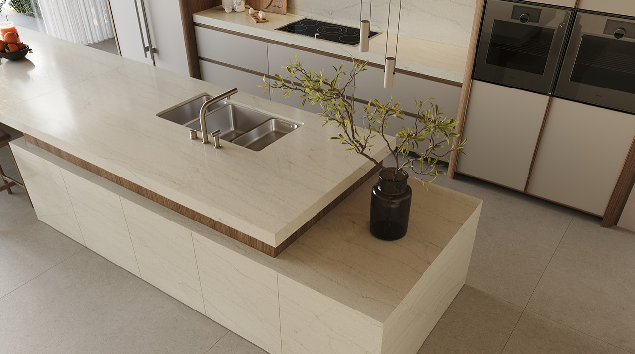 Neolith’s new Taj Mahal quartzite-inspired surface features warm beige tones and delicate ocher veining. Its smooth texture adds depth and a natural elegance, creating a balanced, inviting and luminous look.