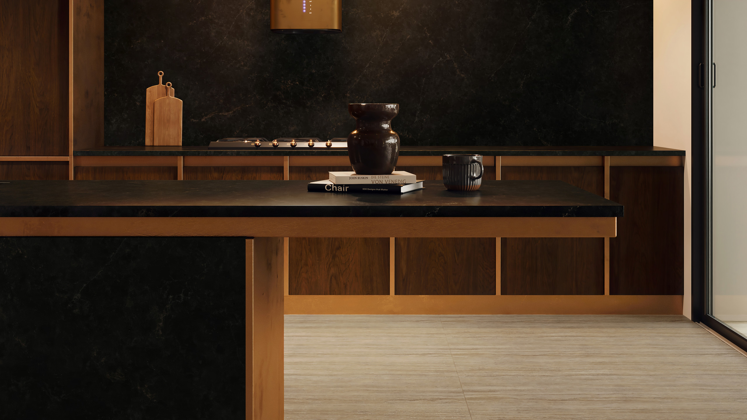 Éclos by Cosentino includes Phantome, a rich black surface with subtle, elegant veining for a sophisticated, contemporary look.