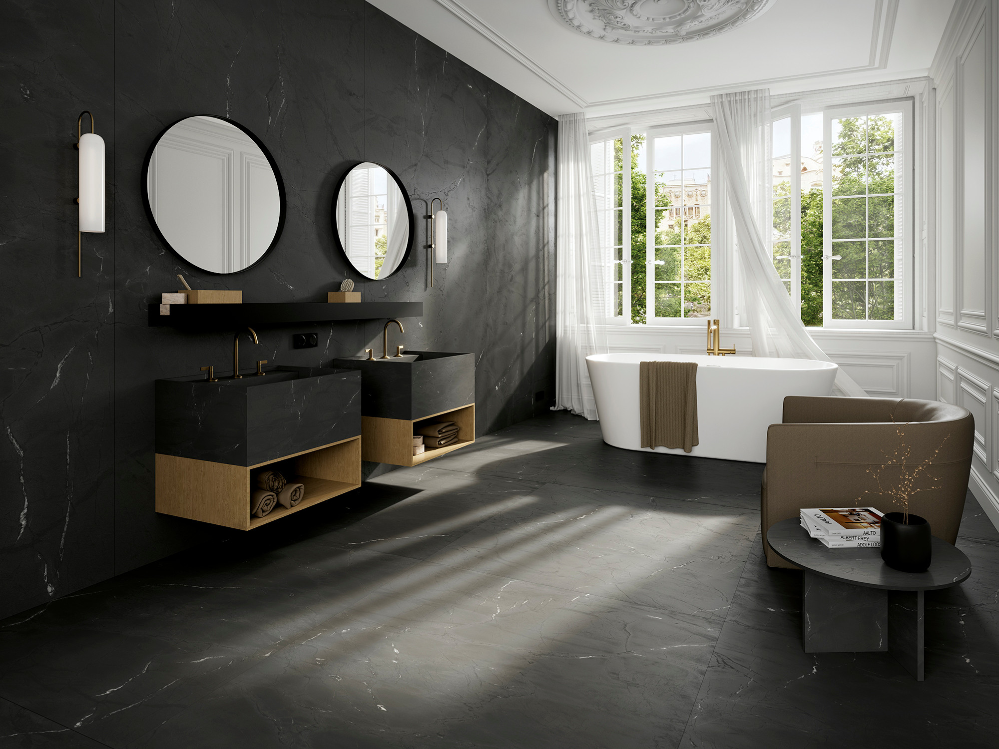 Porcelanosa’s new Negresco collection is inspired by black stone, featuring deep, intense tones highlighted by fine white veining that streaks across the surface like flashes of light.