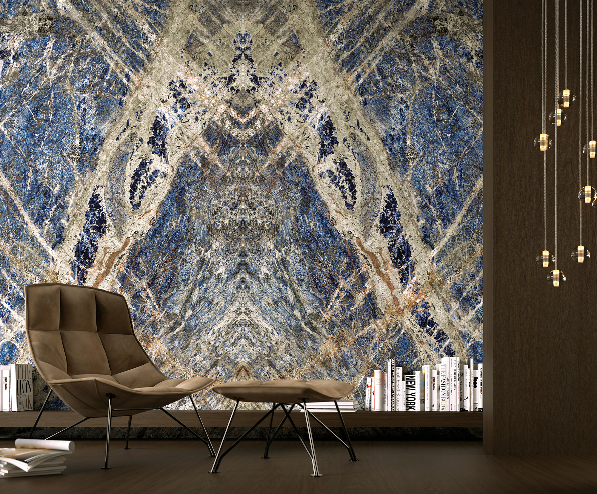 Blue makes a statement in Porcelanosa’s new Andes Blue porcelain from the large-format Xtone collection. Shown here in book-matched slabs with a polished finish, the porcelain has a deep blue background highlighted by intricate golden, white and coppery veining.